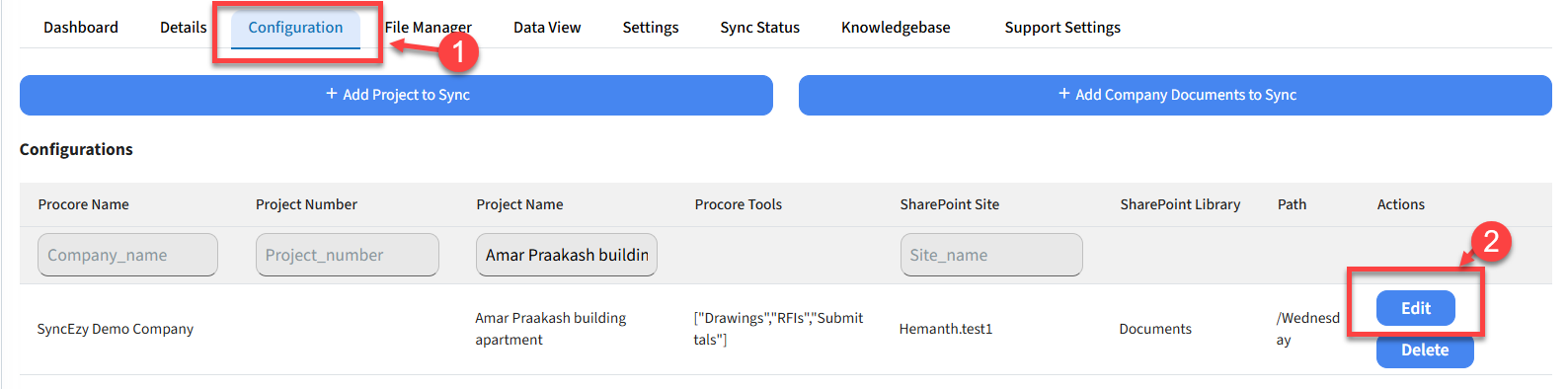 2. Edit Project: Locate the project you want to edit and click on the Edit icon given on the right side of the project configuration. Keep in mind that you can't edit the project if all tools are already selected, or if you're using company documents or folder sync feature.