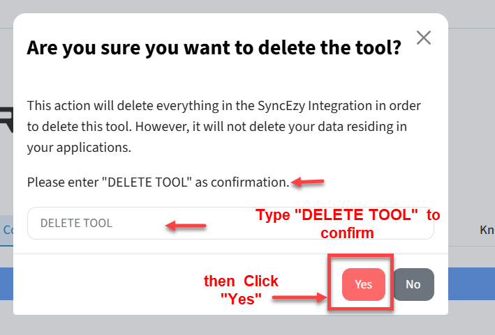 A confirmation pop-up will appear. Type “DELETE TOOL” into the text box to proceed