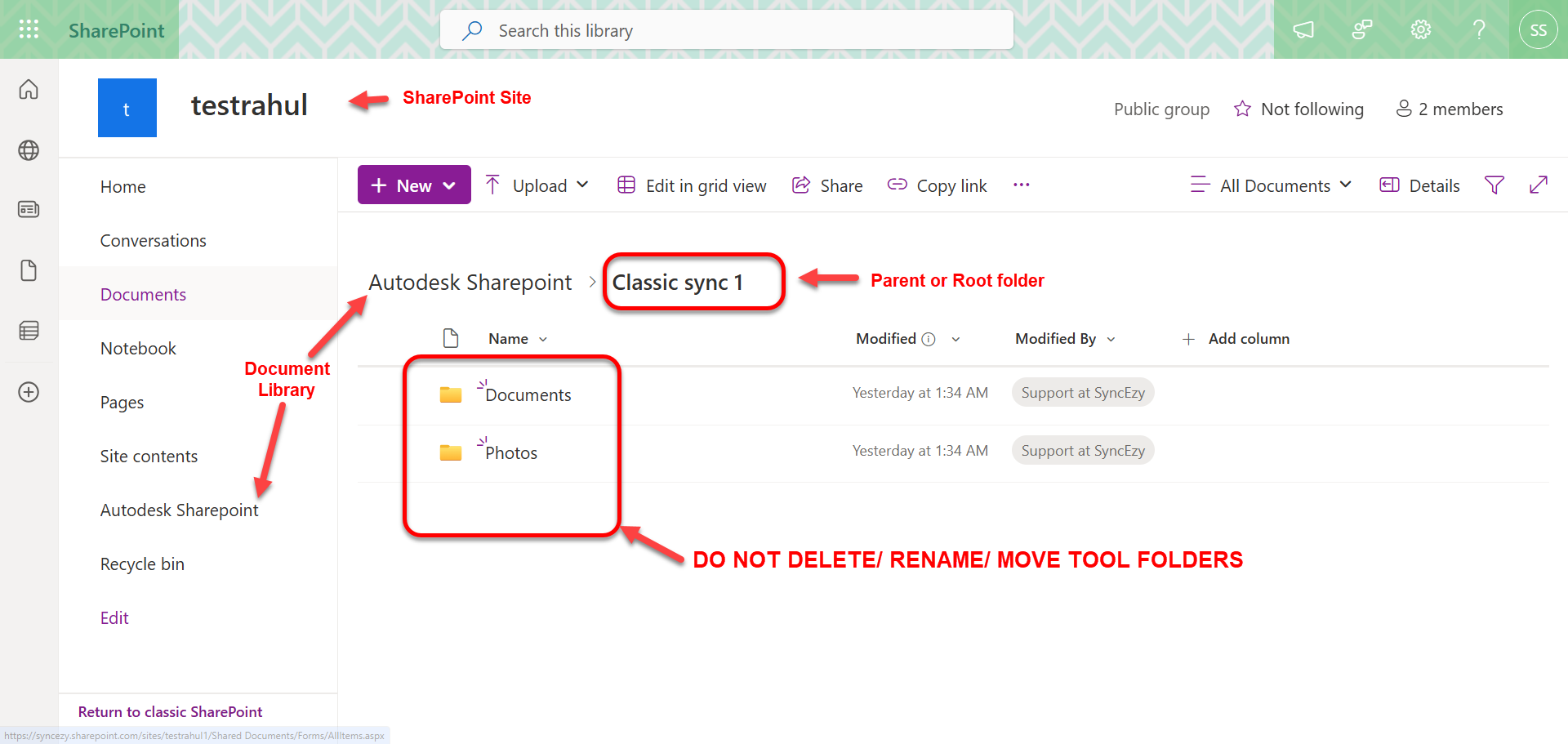 To maintain the integrity of the sync, we have to start the integration from scratch in a new top-level folder in SharePoint. Once the initial sync is complete and the data structure is created in SharePoint, you can move your existing data from the existing folders into the Documents folder created by SyncEzy.