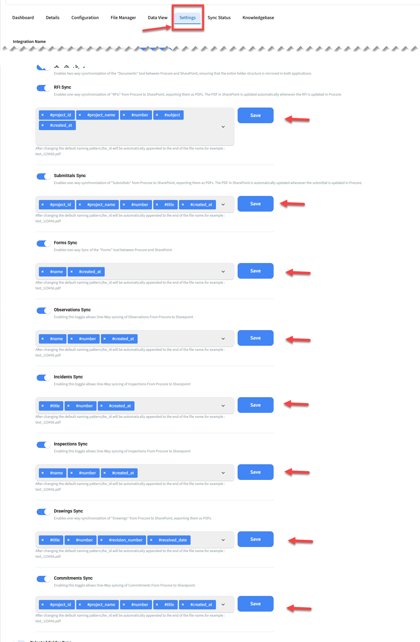 The Procore–SharePoint integration now supports a custom file name structure for one-way sync tools. This feature allows you to define how files are named when they are synced, making it easier to identify, organize, and manage documents within SharePoint.