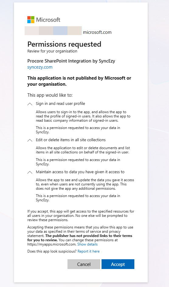 SyncEzy can access the SharePoint site to configure project integrations