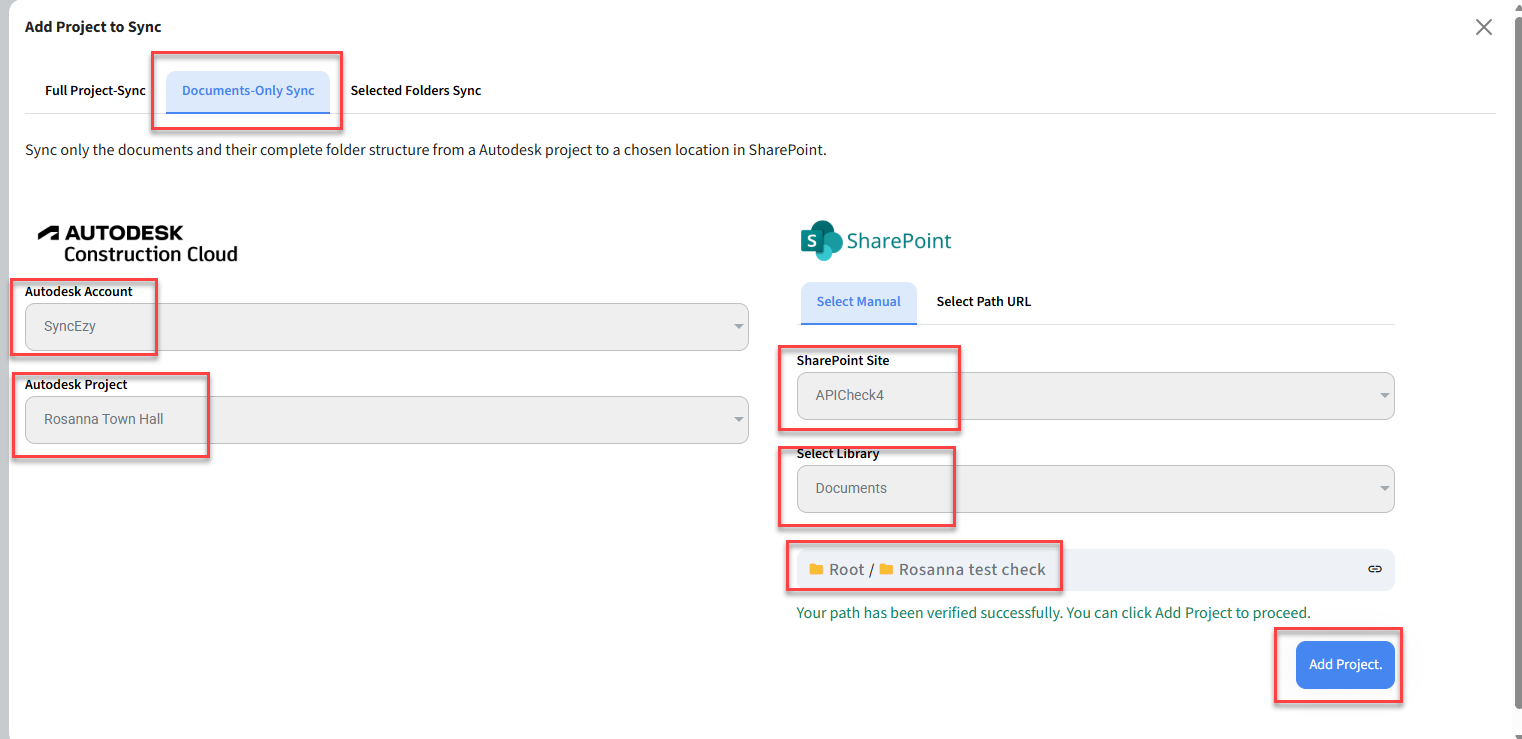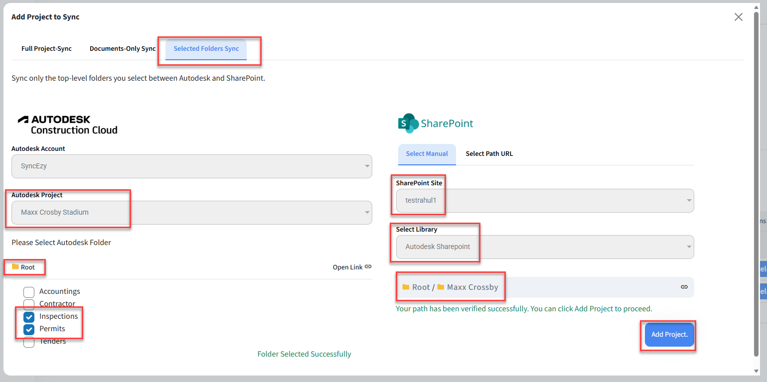 Once you have clicked on "Add Project" your project will be added to the integration configuration and folders from the Autodesk Construction cloud Documents tool will be created in SharePoint under the chosen path folder during the initial sync. Please do not change/rename/move/delete root folders as the sync will break.