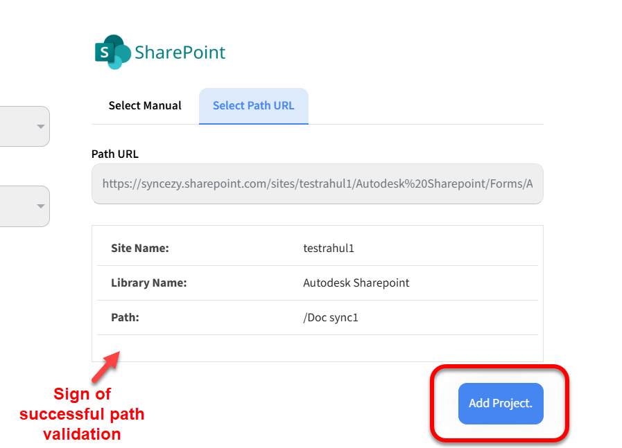 Once you click on "Add Project" the project will be added to the configurations and selected folders will be created in your chosen location in SharePoint. (Refer to the screenshot below)