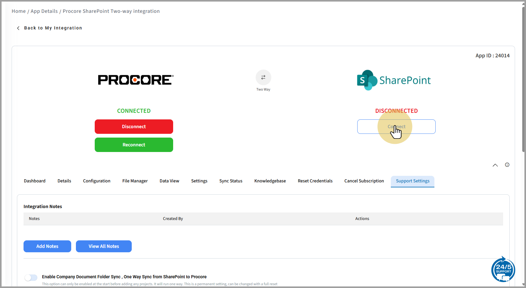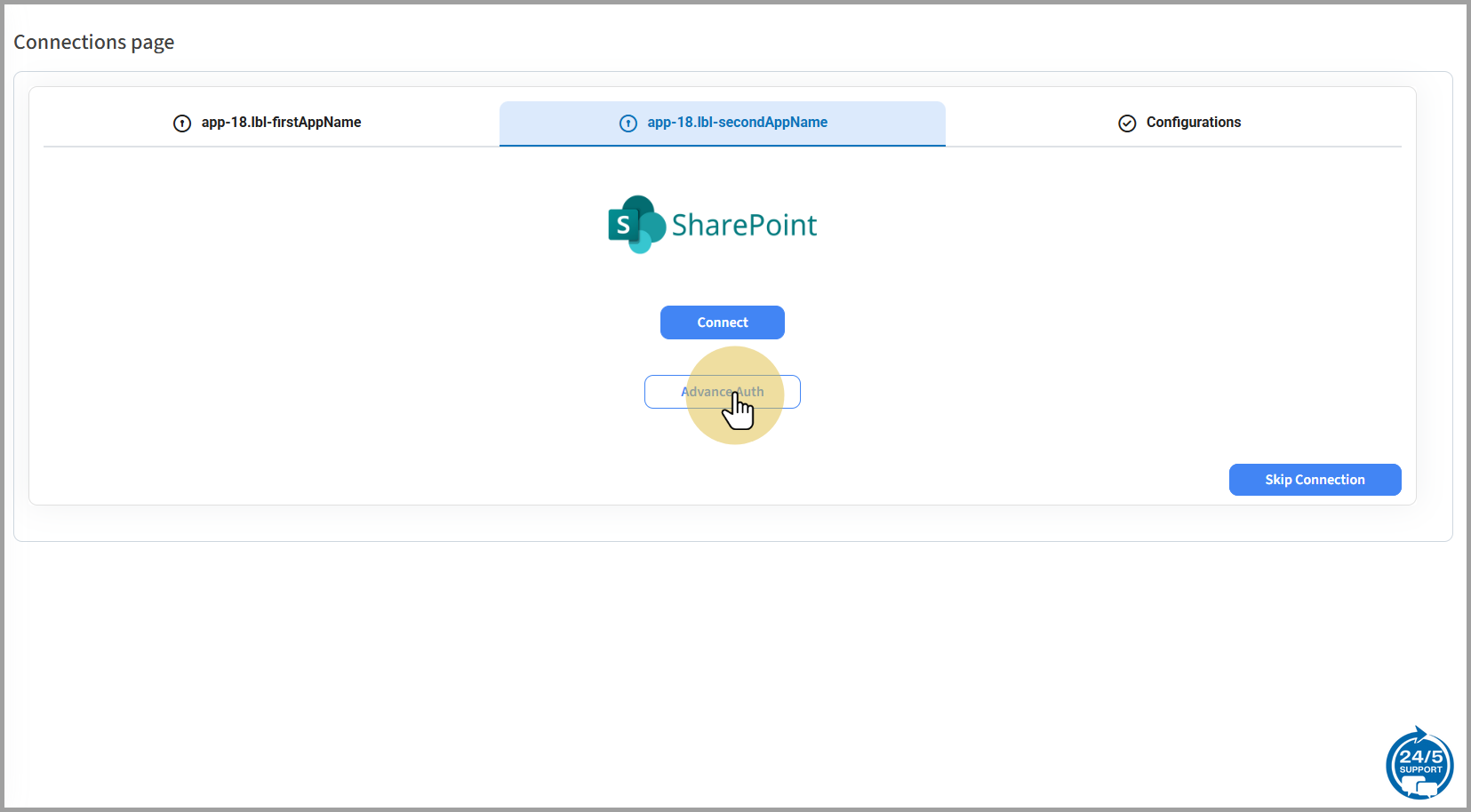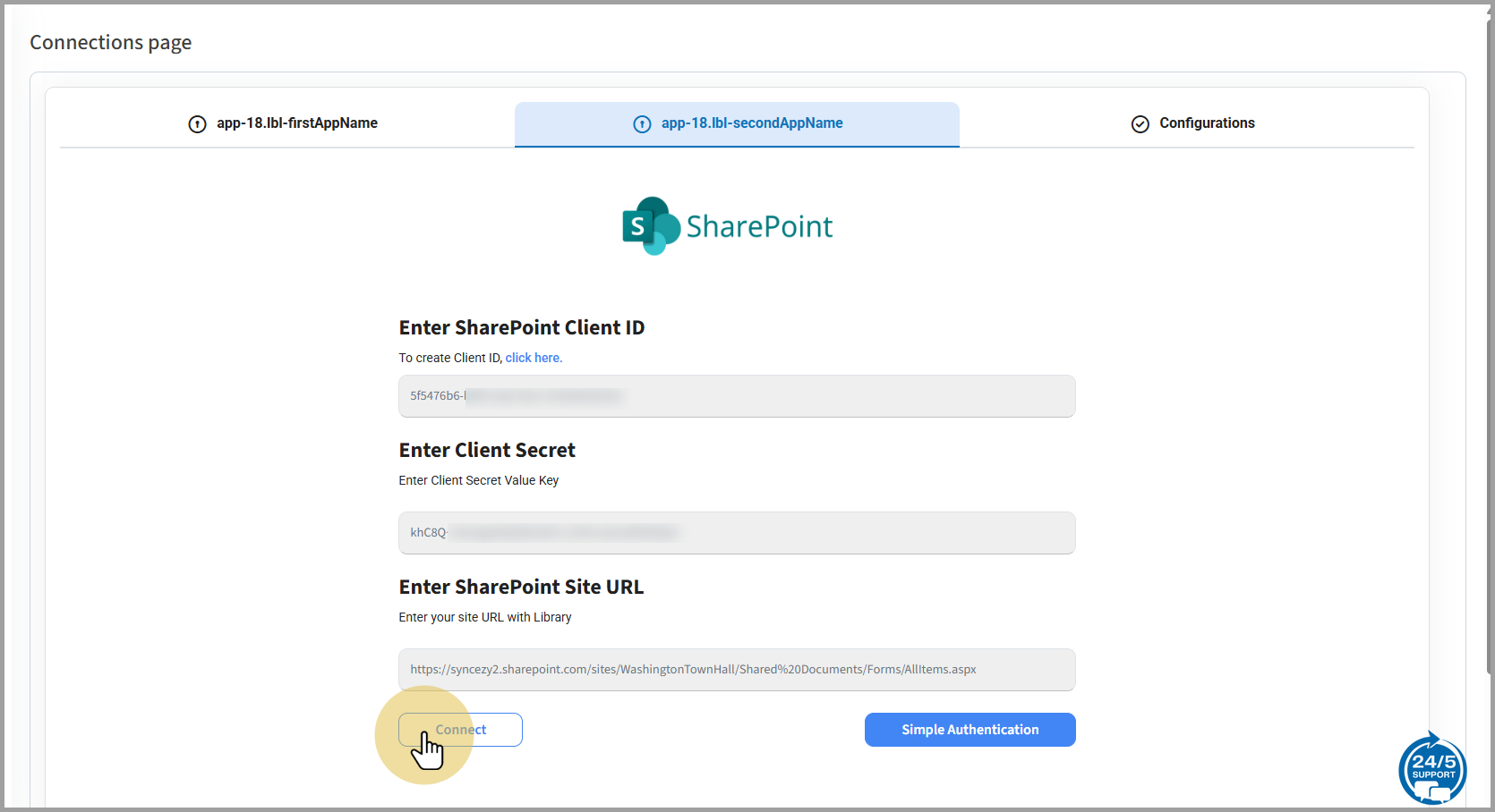 41. Enter the custom app Client/Application ID and the Secret Value Key that you saved earlier. Then copy the full SharePoint site URL you want to connect to the integration, paste it into the field, and click Connect.