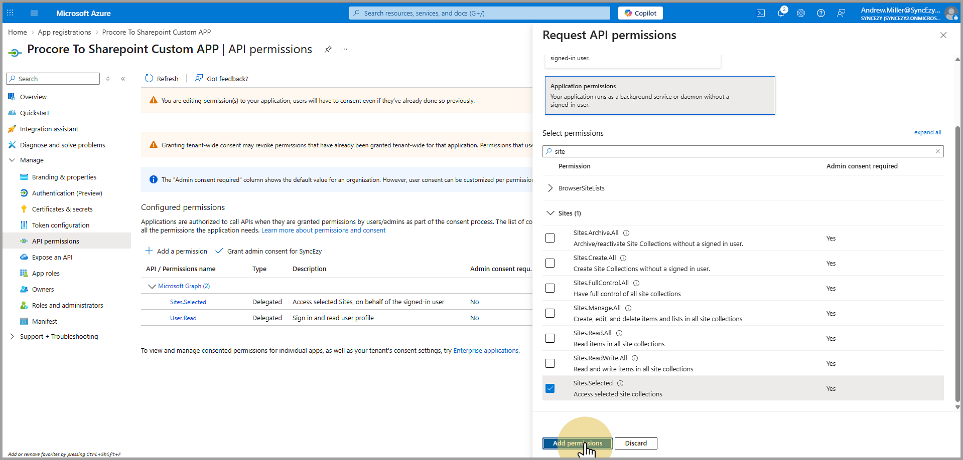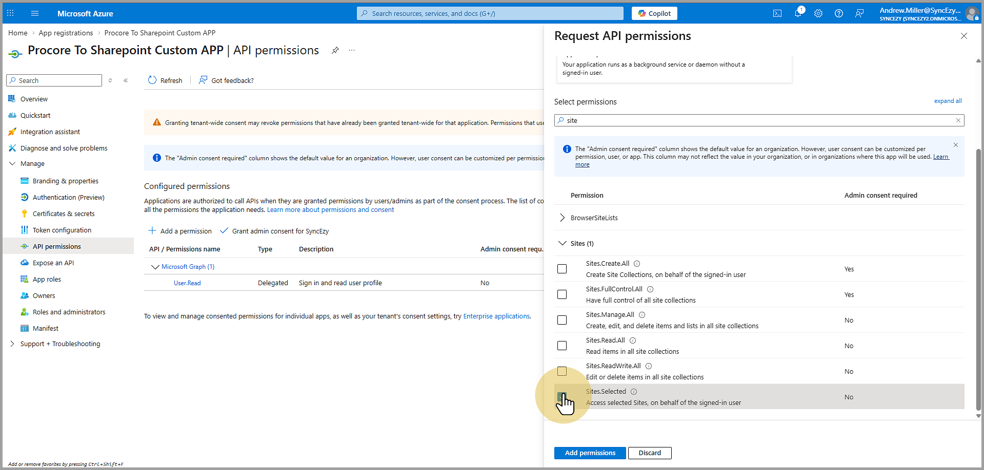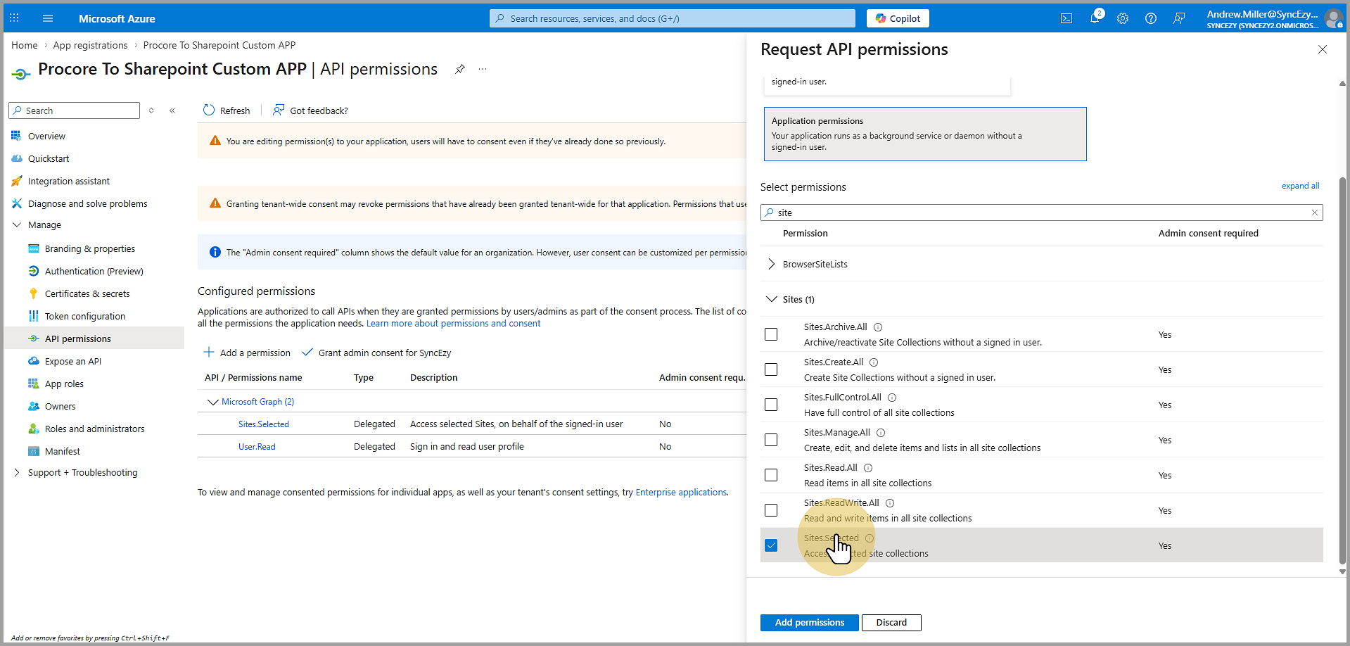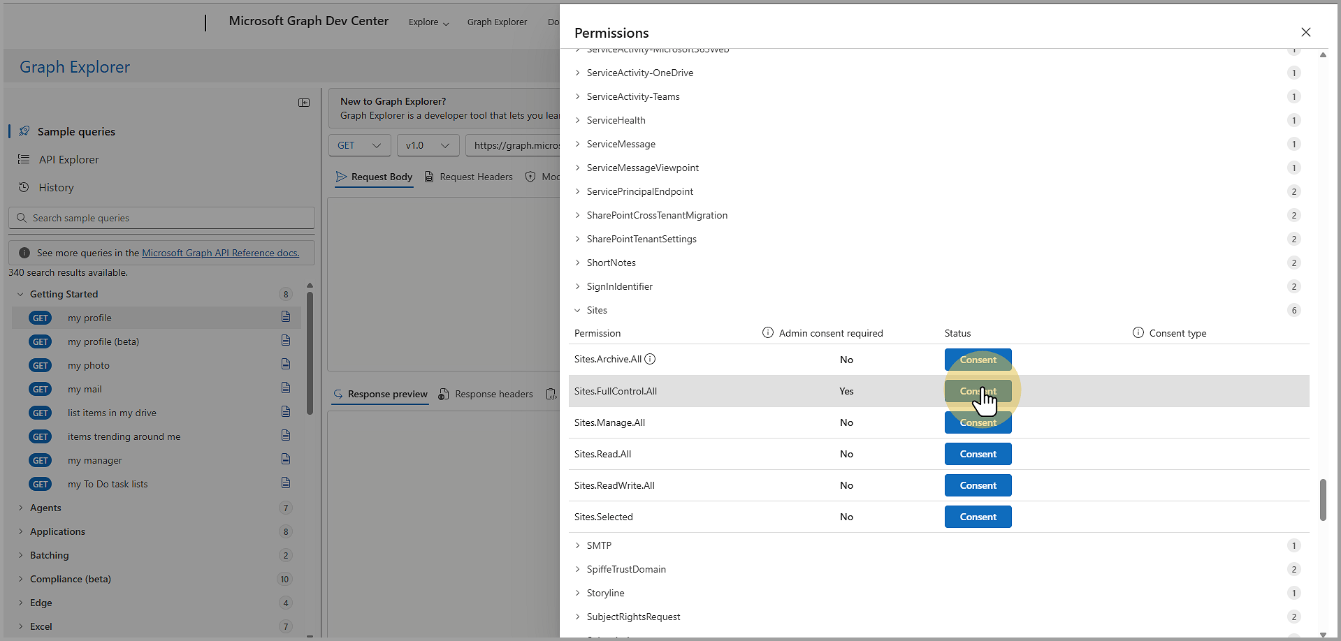 29. Click “Consent to Sites.FullControl.All”. This permission is temporary and will be removed once access has been granted for the specific site, after which the app will be deleted.