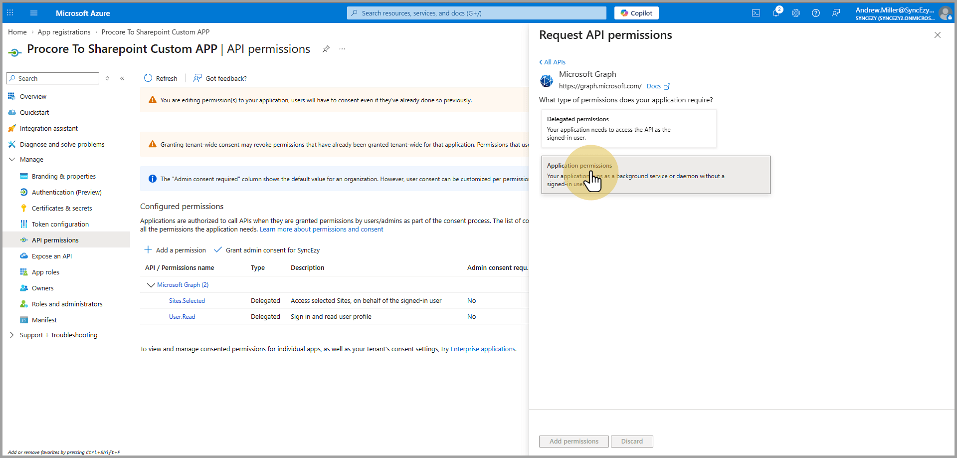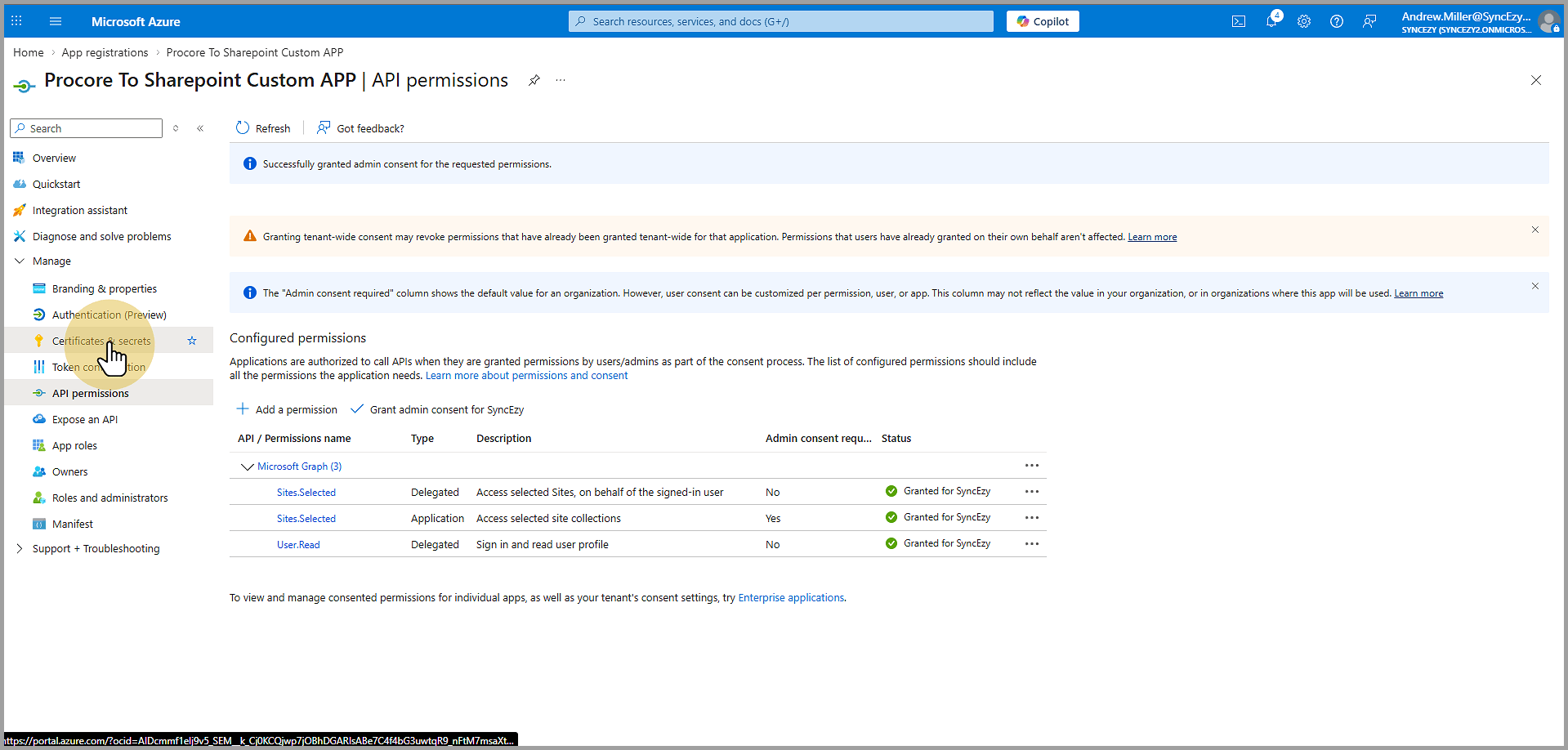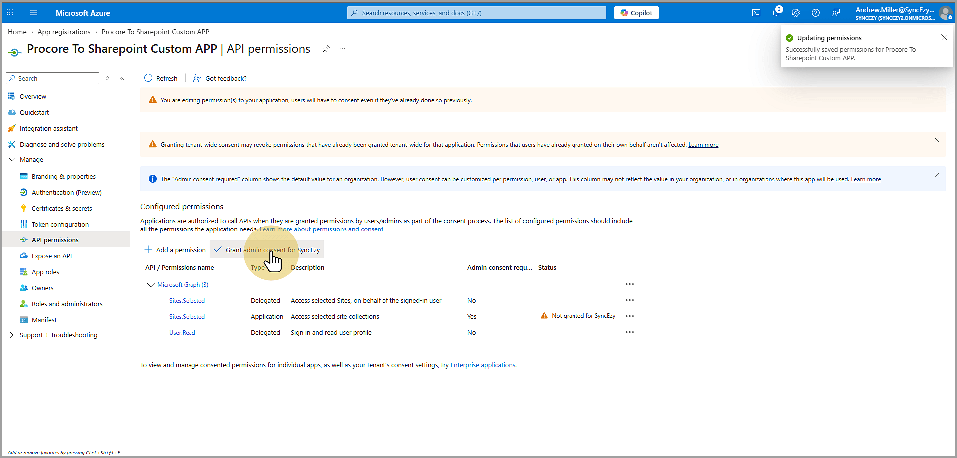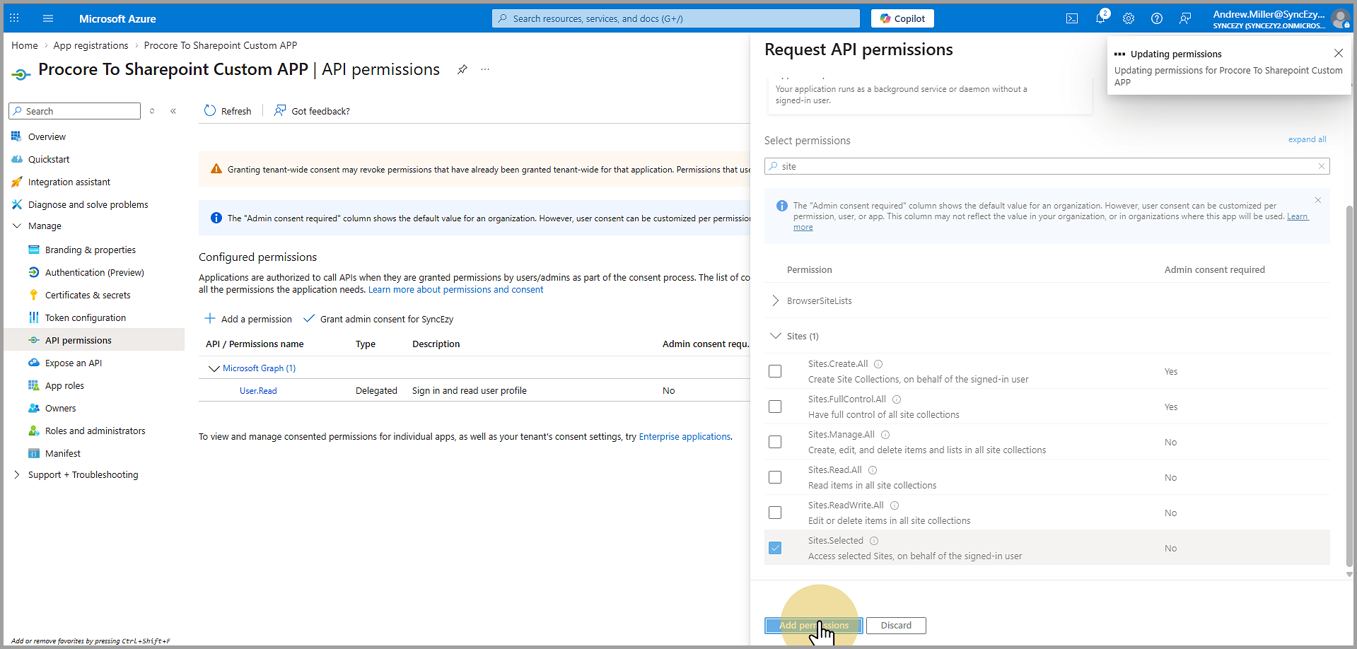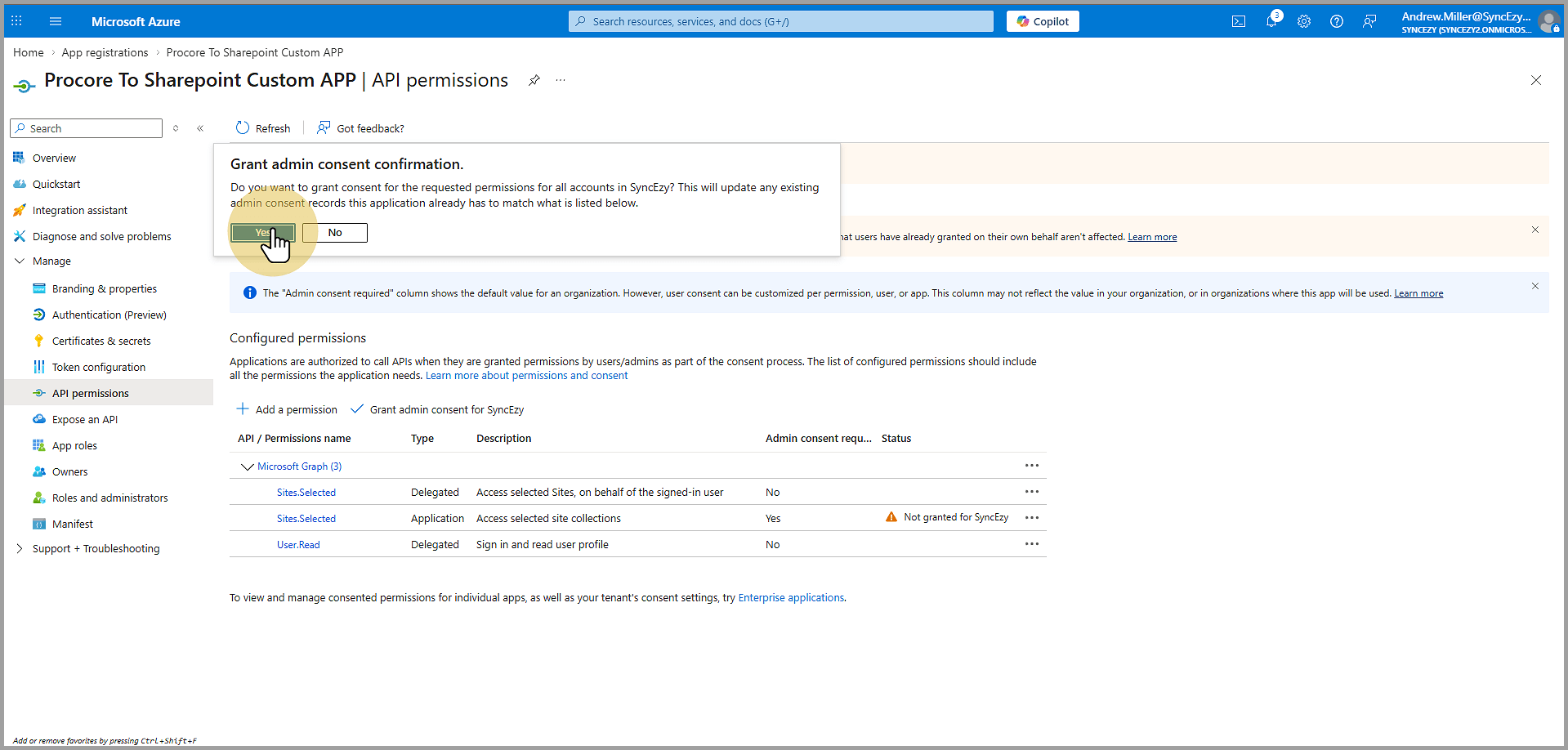29. Click “Consent to Sites.FullControl.All”. This permission is temporary and will be removed once access has been granted for the specific site, after which the app will be deleted.