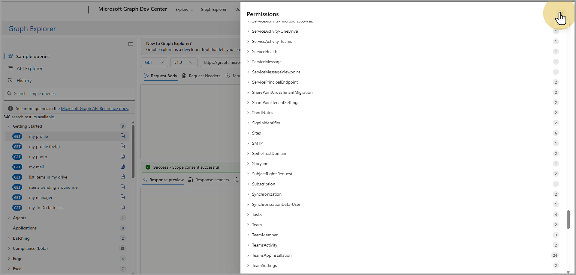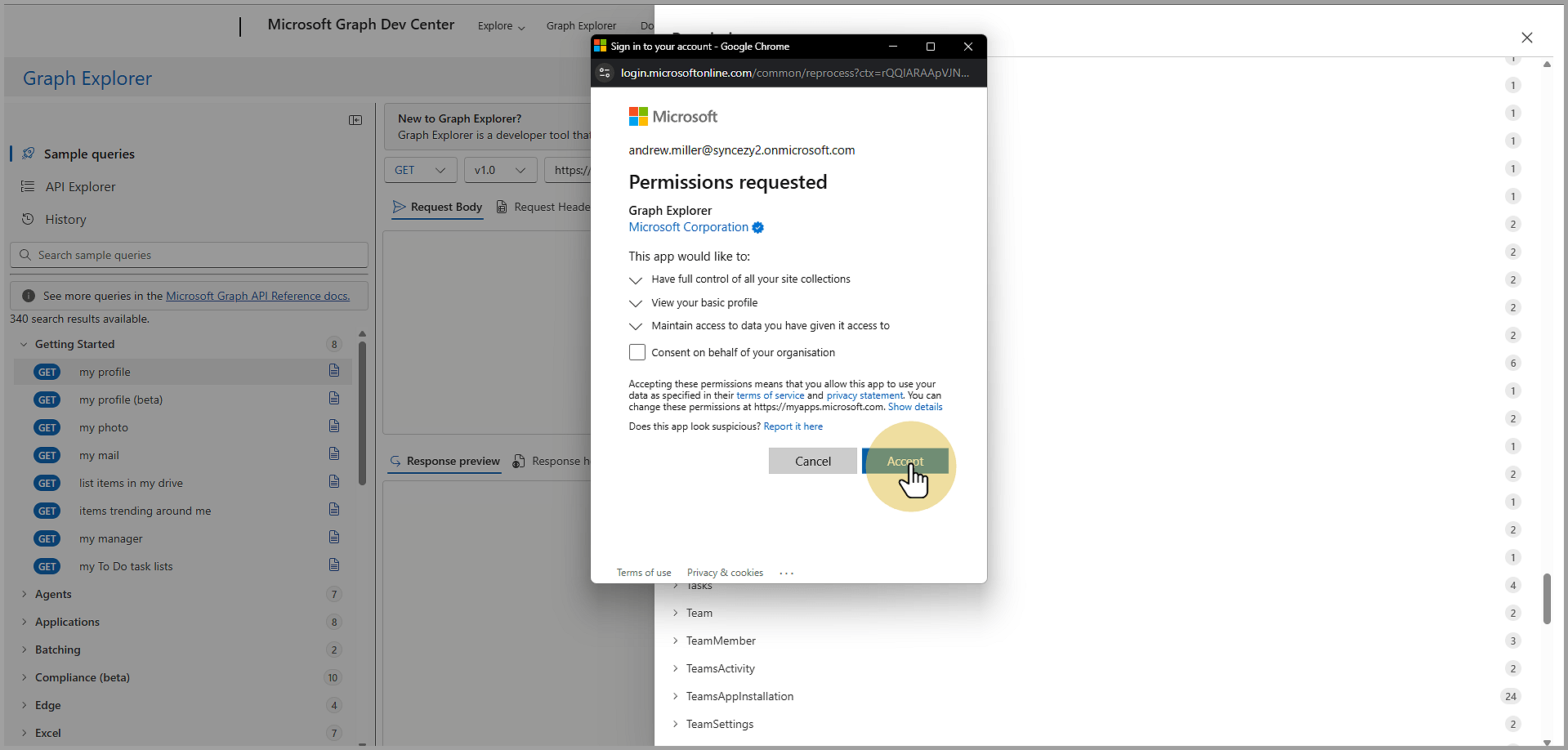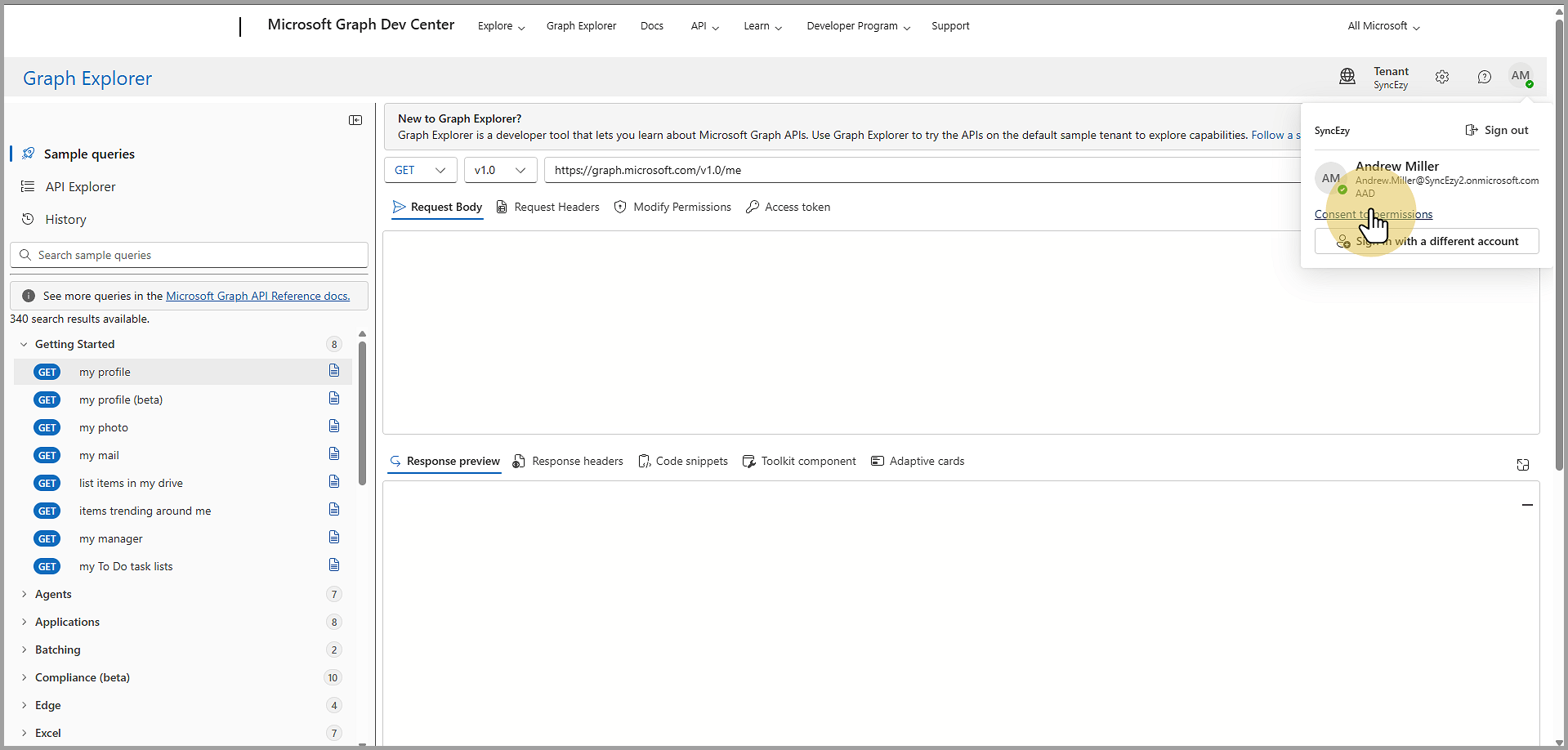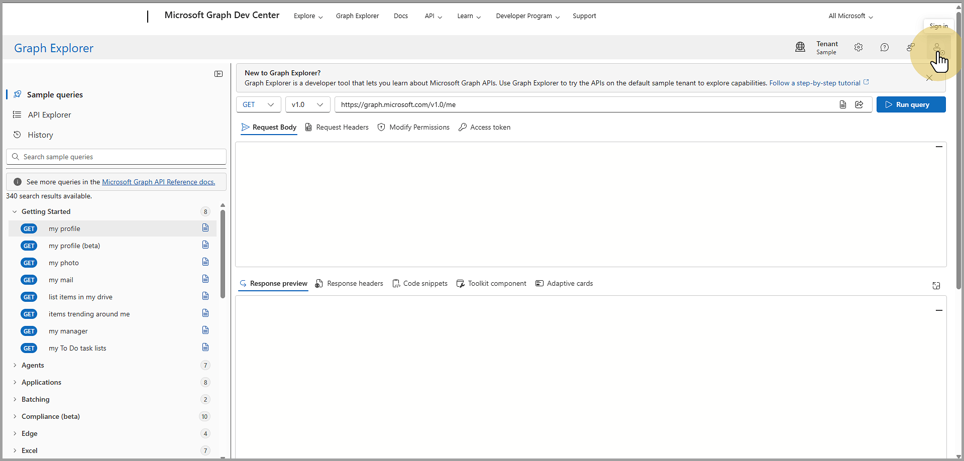26. Navigate to https://developer.microsoft.com/en-us/graph/graph-explorer and Sign in