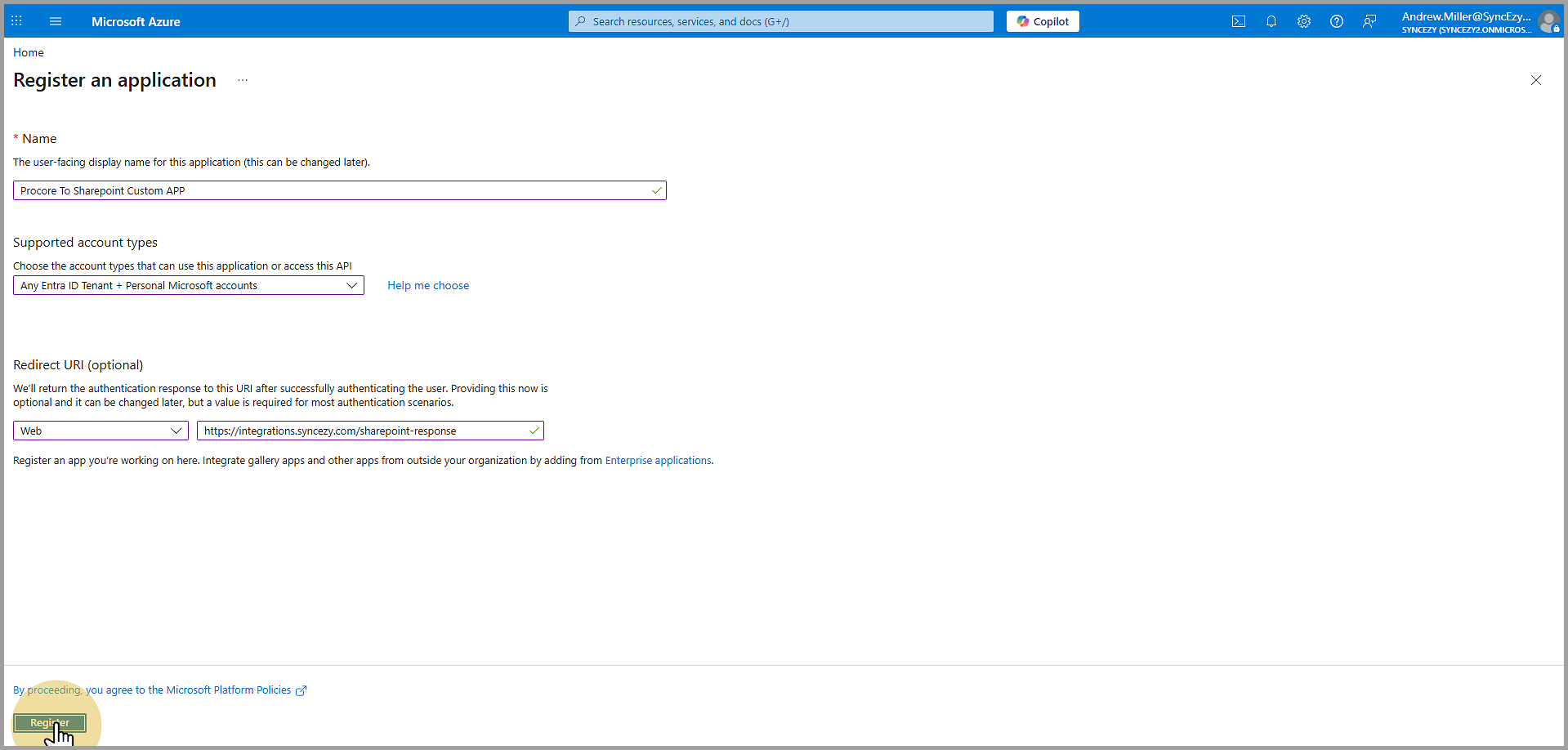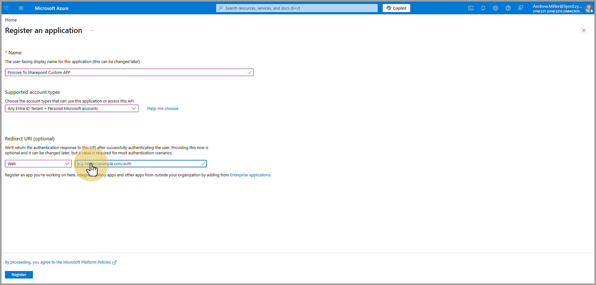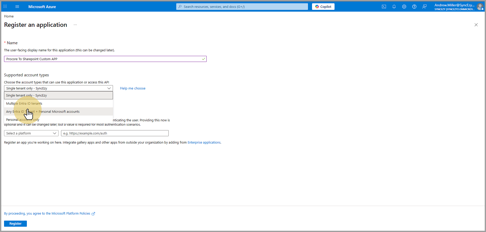 3. Provide custom app name and In the supported account types select "Any Entra ID Tenant + Personal Microsoft Accounts"