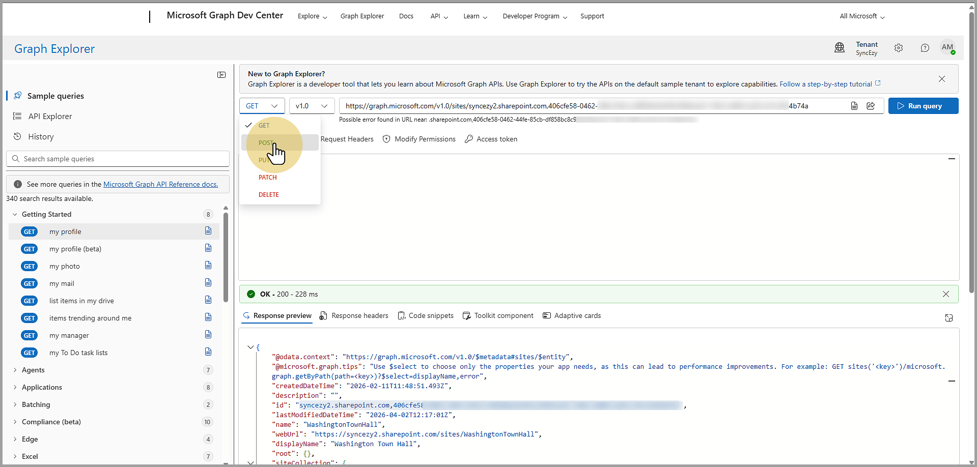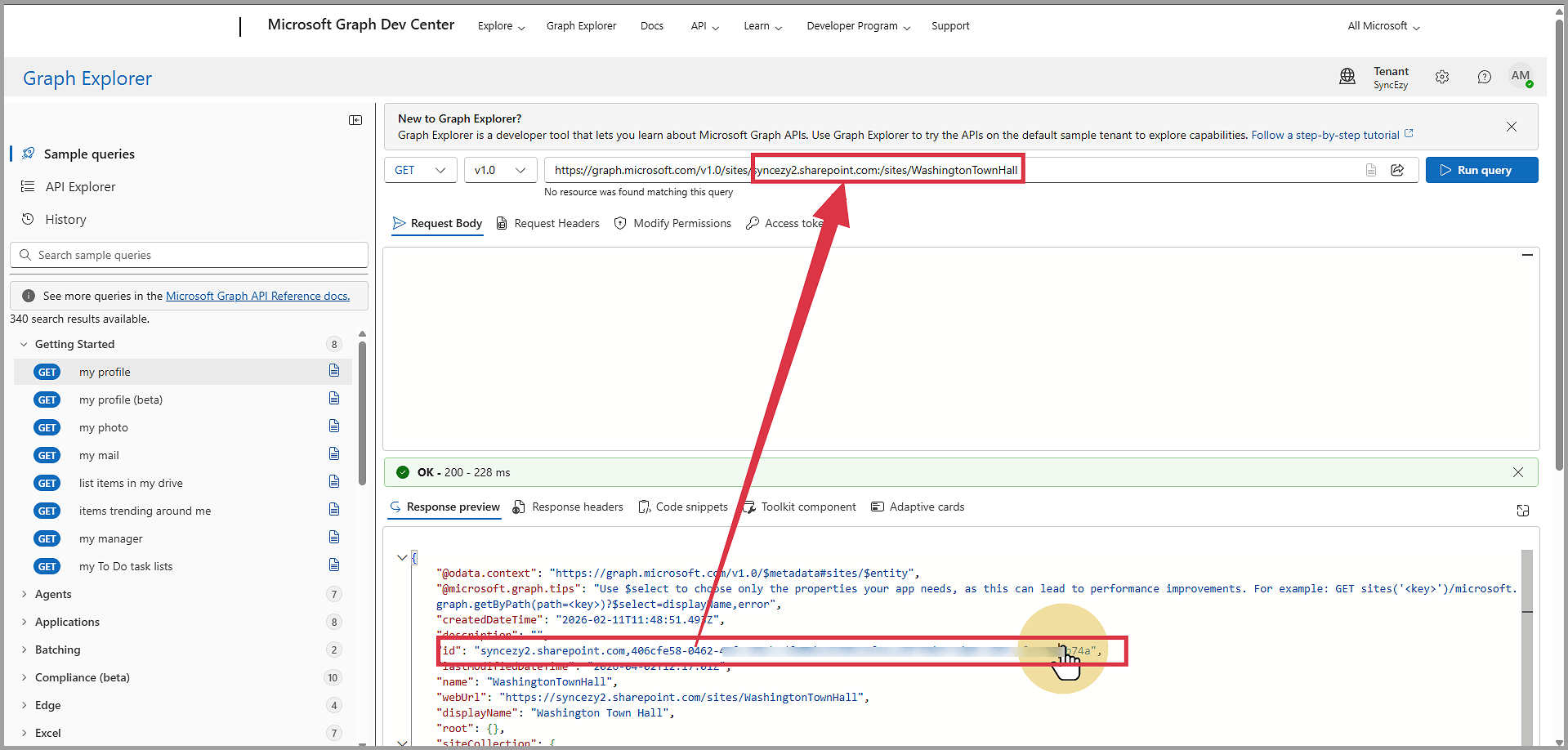 So the final format becomes: https://graph.microsoft.com/v1.0/sites/syncezy2.sharepoint.com:/sites/WashingtonTownHall