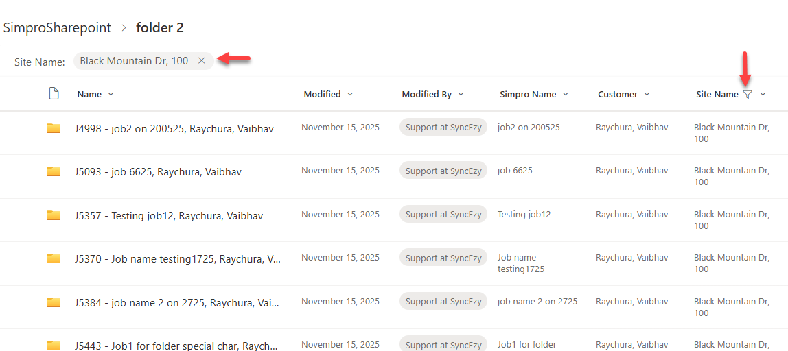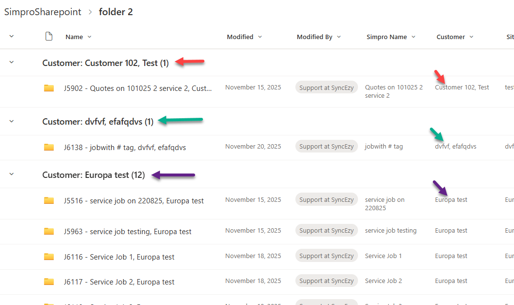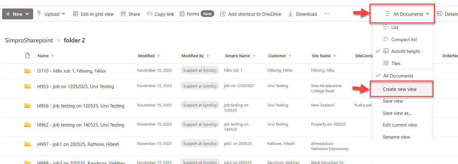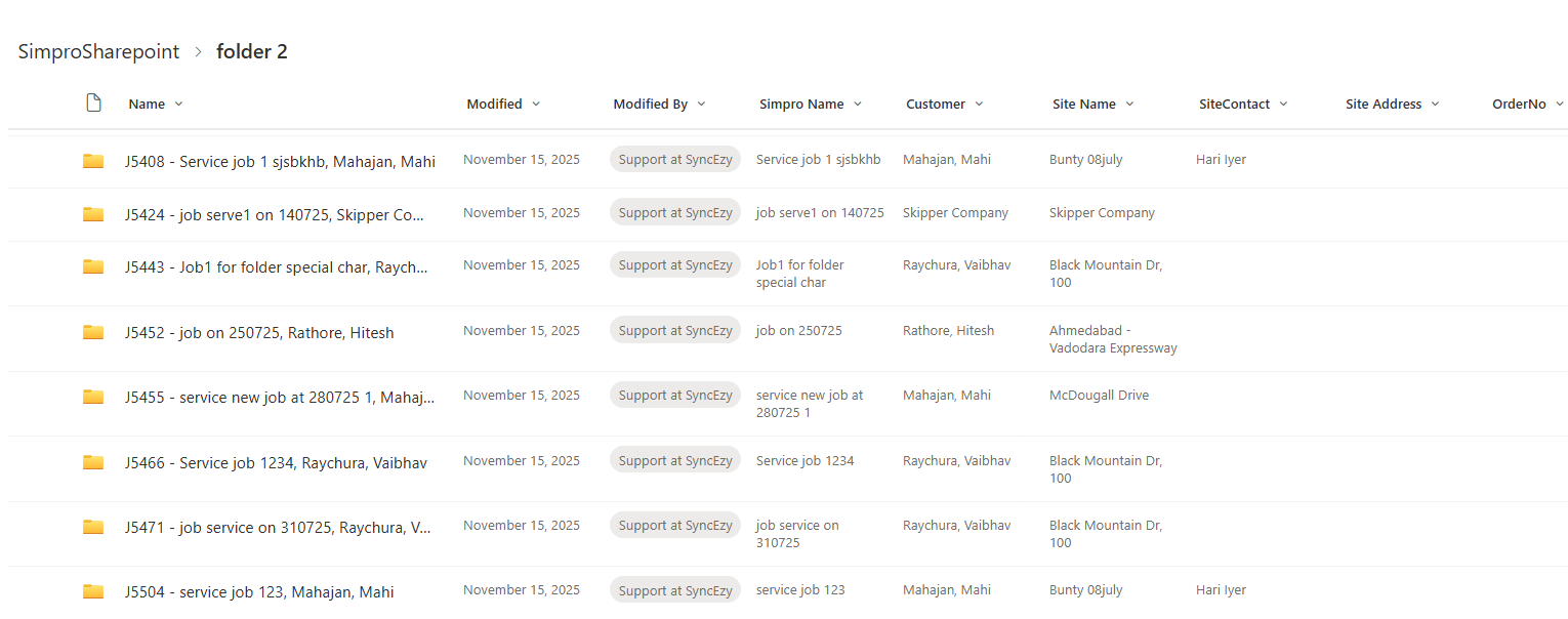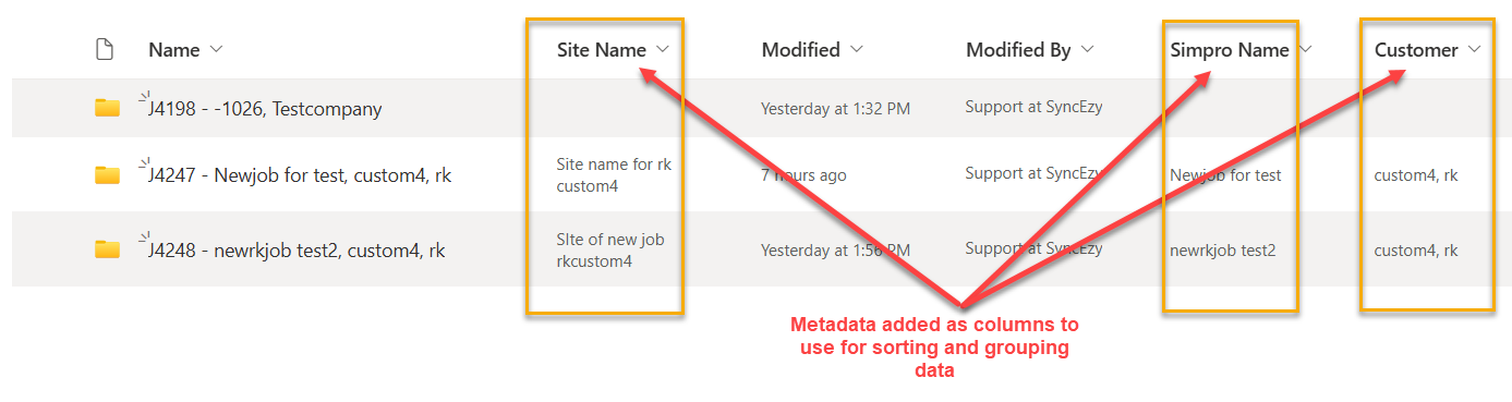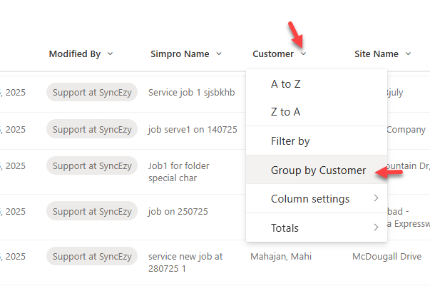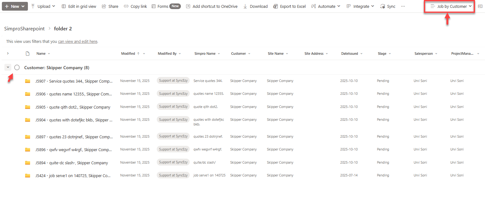 By utilizing SharePoint Views and the metadata synced by SyncEzy, you can turn a flat list of folders into a dynamic database. This allows your team to find Job folders based on the Customer, Site, or Simpro Name instantly, without needing to manually organize sub-folders.