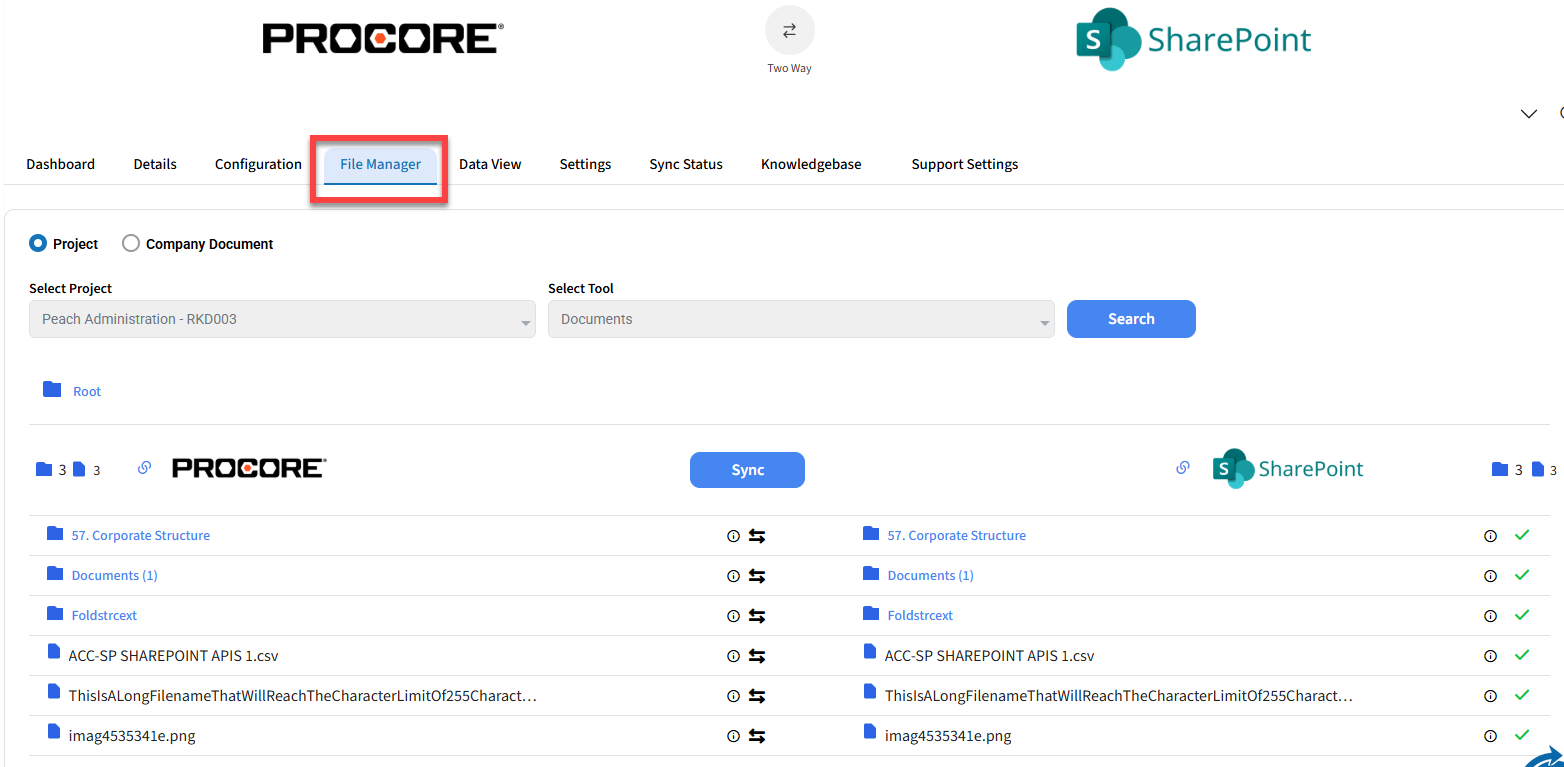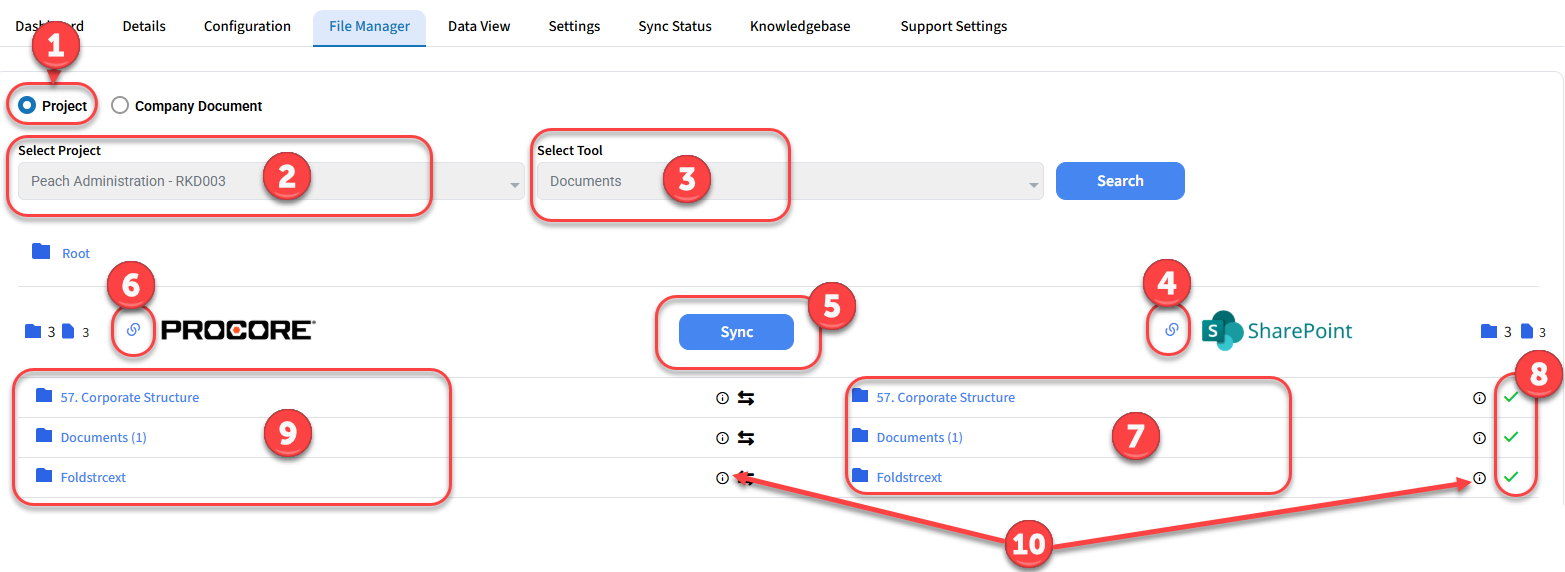 8 - The green tick marks indicate that the files/folders are synced and matching between both systems. If it is not matching or synced, it will appear with a red cross and the text in either the Procore or SharePoint side will be greyed out.