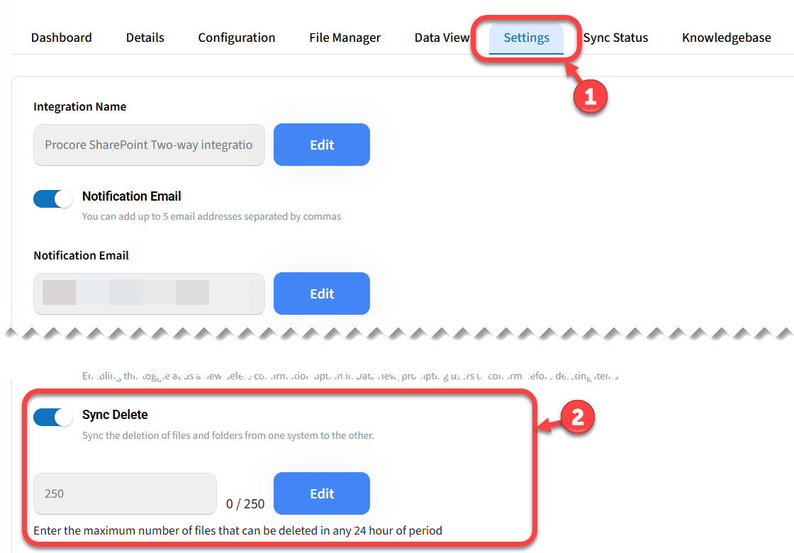 To safeguard against unintended mass deletions, the Sync Delete feature includes an option to set a deletion limit. This limit represents the maximum number of files and folders that can be deleted within any 24-hour period through the integration. The limit is applicable across the entire account, including all projects.