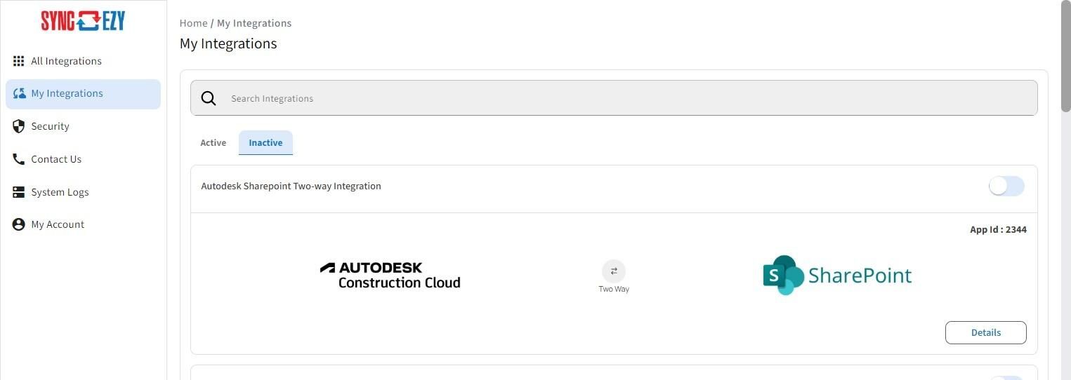 9. Click on Details button to open the integration