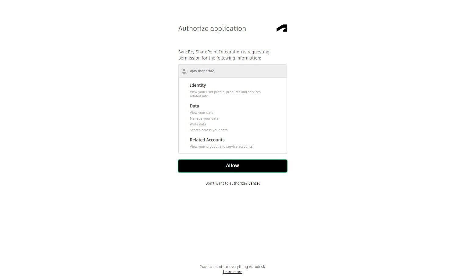 11. Enter the credentials to authorize your Autodesk account.