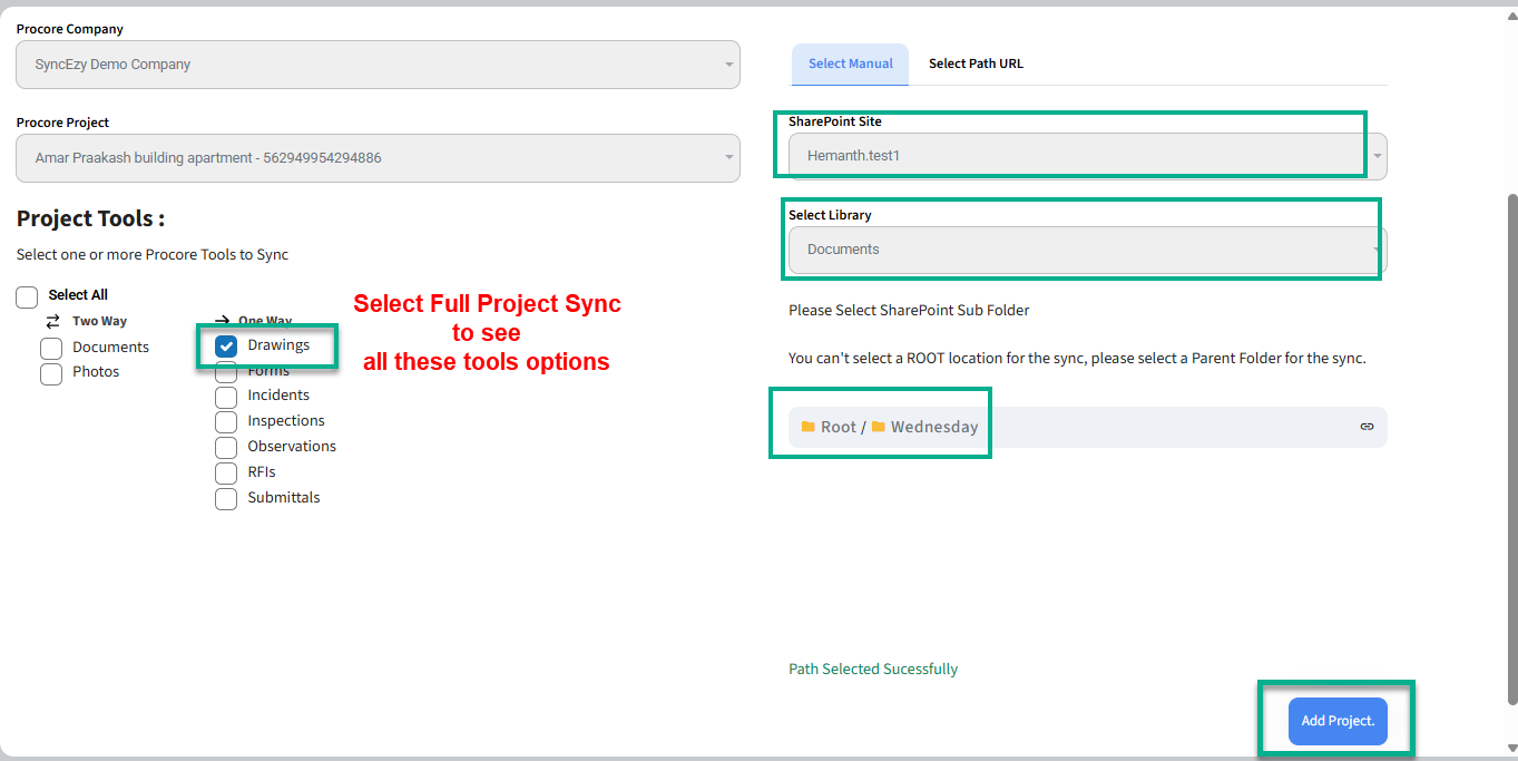 - In SyncEzy, navigate to "Add Project to Sync" and choose "Full Project Sync". Ensure that the "Drawings" option is checked.