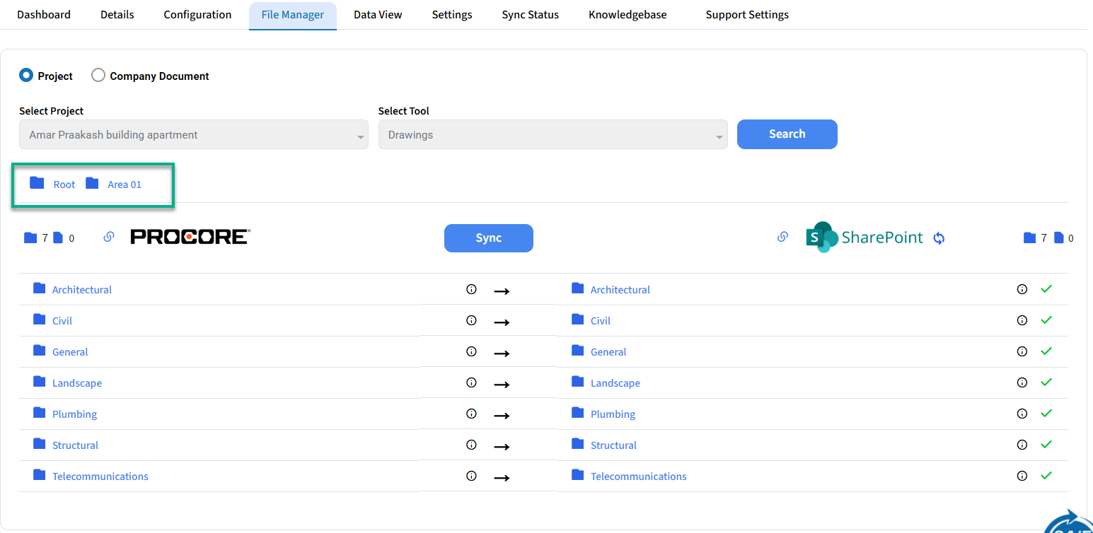 Once the sync is enabled, SyncEzy creates a parent folder in SharePoint named “Area 01”. All drawings will be organized within subfolders under “Area 01”.