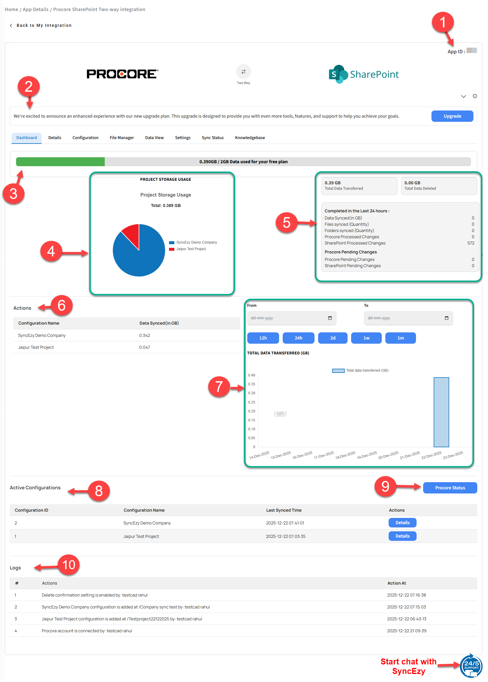 Please note: For example, if this feature is enabled and your sync delete limit is set to 25 in 24 hours and you have deleted 100 files from SharePoint, the deletion of 25 files only will be synced back to Procore. This means those 25 files only will be deleted from both applications (you are syncing your deletes). However, the deletion of the remaining 75 files will remain unsynced in Procore unless those files are deleted manually from Procore. These 75 files will be shown as unsynced when you check the File Manager in your SyncEzy Integration Portal. To avoid this we recommend you to increase the Sync Delete limit to 10000 or more. The deletion limit can be changed in the Details menu.