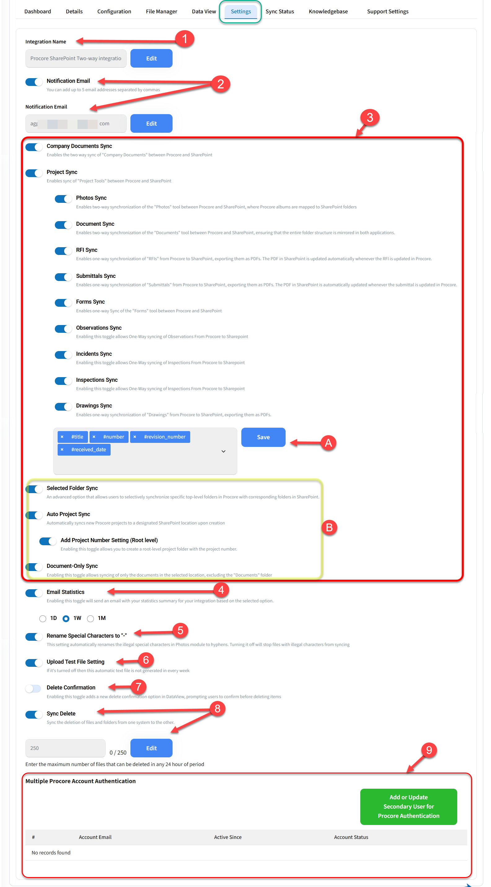 A- Drawing Tool Sync- File name Customization: Allows users to customize the file naming convention when syncing files from the Procore Drawing tool to SharePoint.