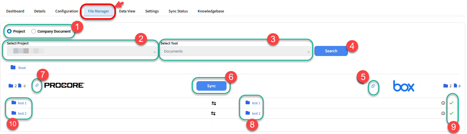 10 - The green tick marks indicate that the files/folders are synced and matching between both systems. If it is not matching or synced, it will appear with a red cross and the text in either the Procore or Dropbox side will be greyed out.