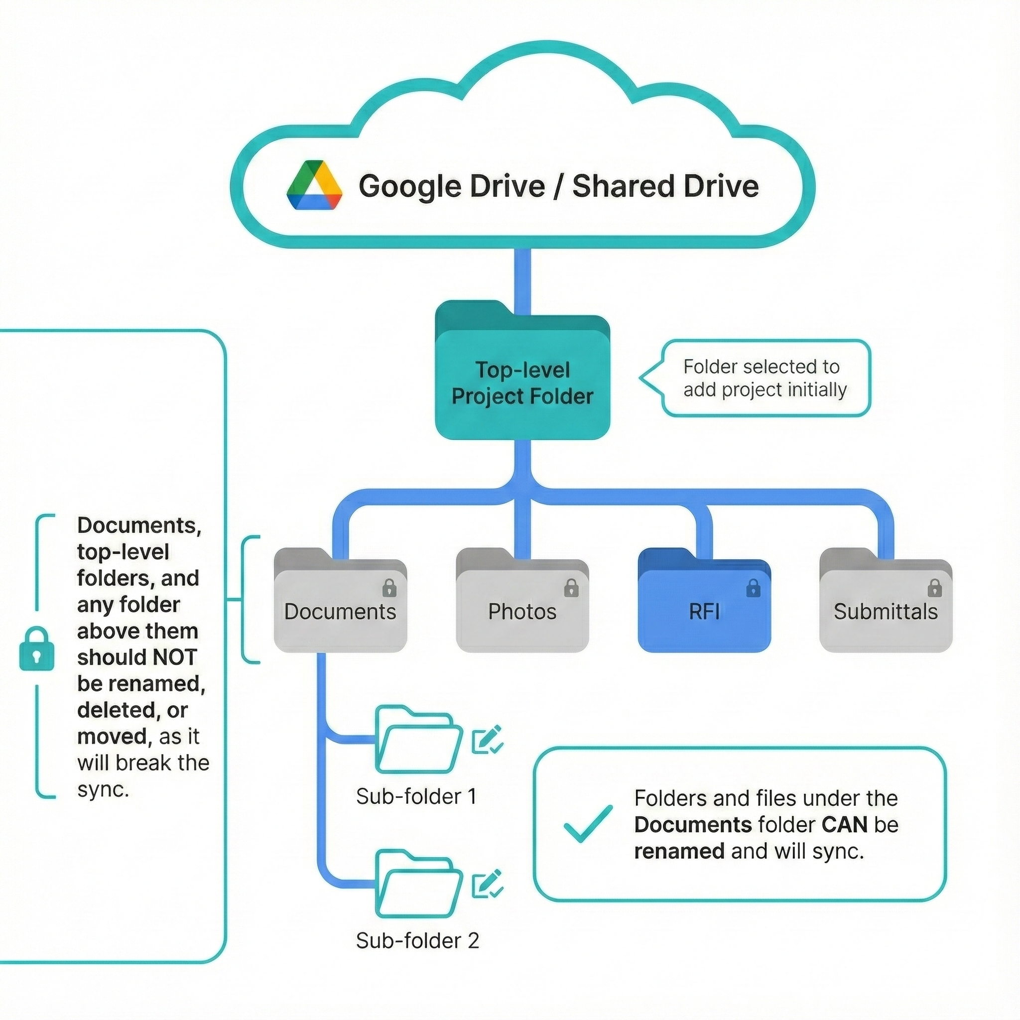 Make sure your team does not change the first three levels of folders in the Google Drive Folders.