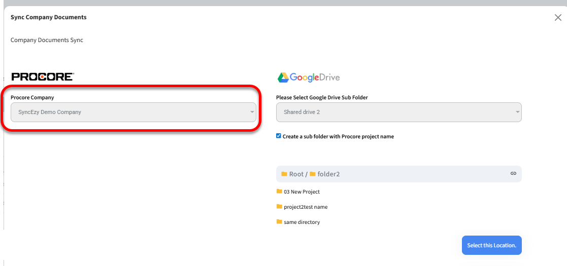 Please note that if you check the 'Create a Sub Folder with Procore Project Name' option, it will create two subfolders: one with your company name and another named 'Company Documents' within the root folder you've chosen for syncing your company documents."