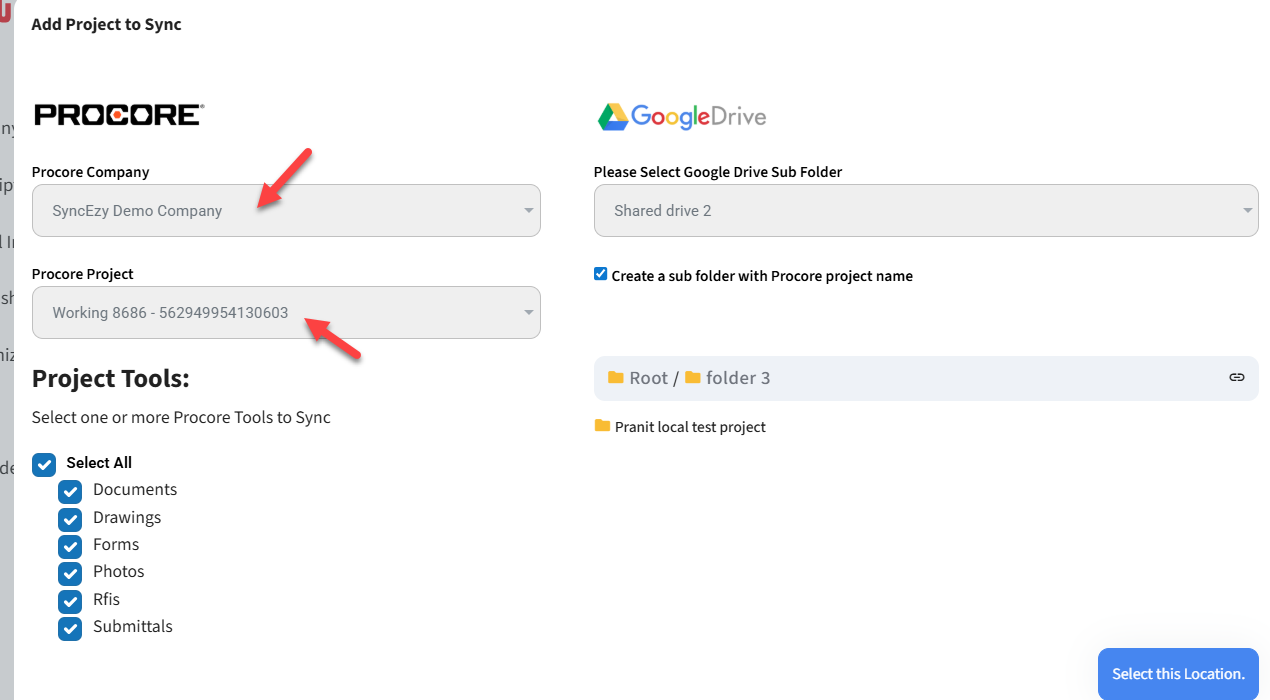 Yes. The integration Portal has a configuration settings area where this can be configured. You can sync projects from multiple Procore Companies to a single Google Drive account. Or have multiple app subscriptions and connect them to different Google Drive accounts. On the Google Drive end we support My Drive and Shared Drives.
