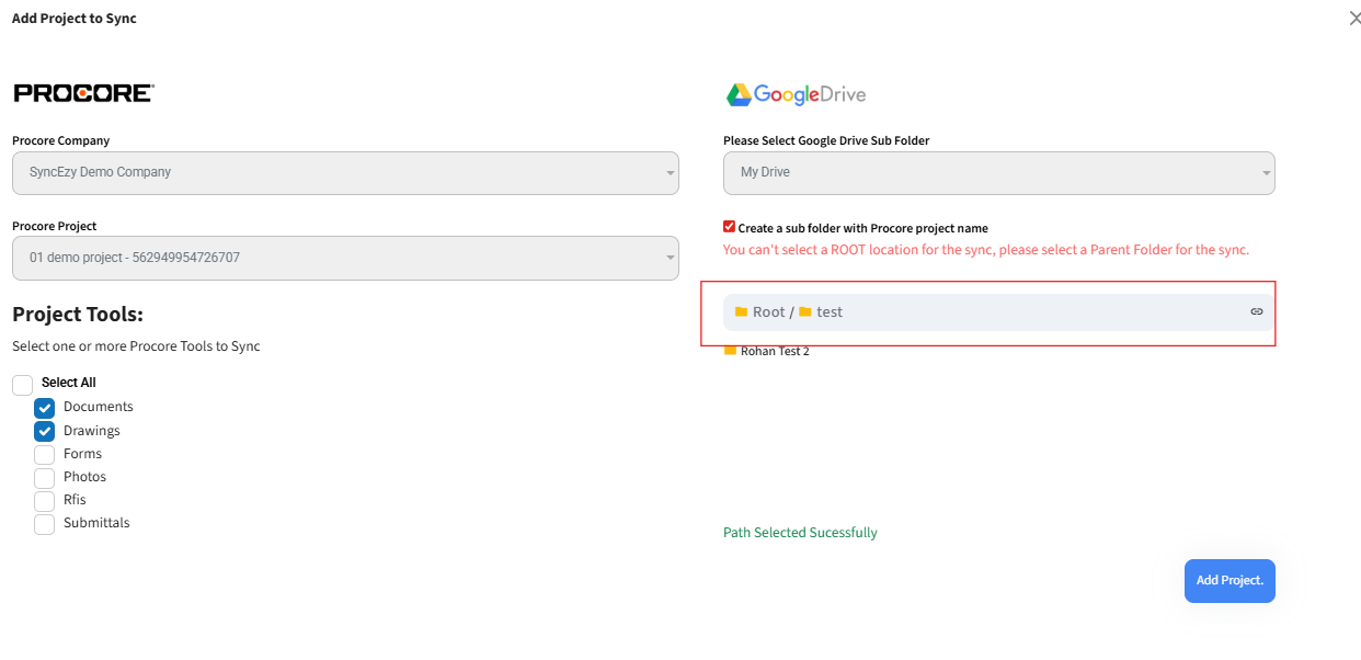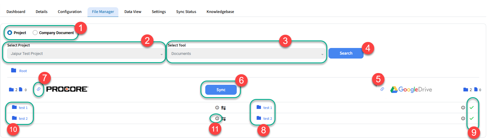 10 - The green tick marks indicate that the files/folders are synced and matching between both systems. If it is not matching or synced, it will appear with a red cross and the text in either the Procore or Google Drive side will be greyed out.