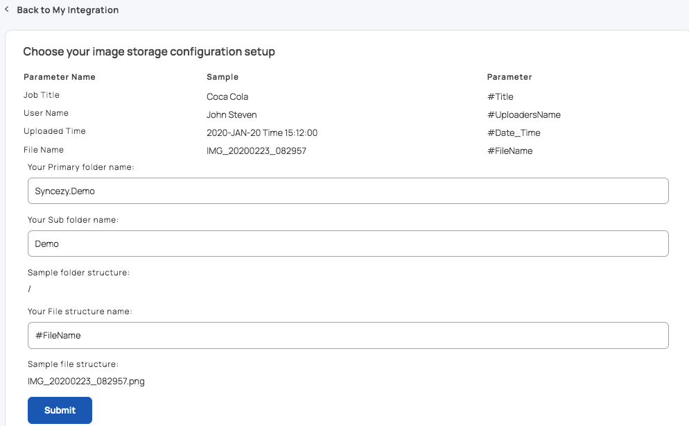 Your Sub folder name: This will be the folder under the Primary folder. You may rename this folder at the time of Integration setup if you wish to.
