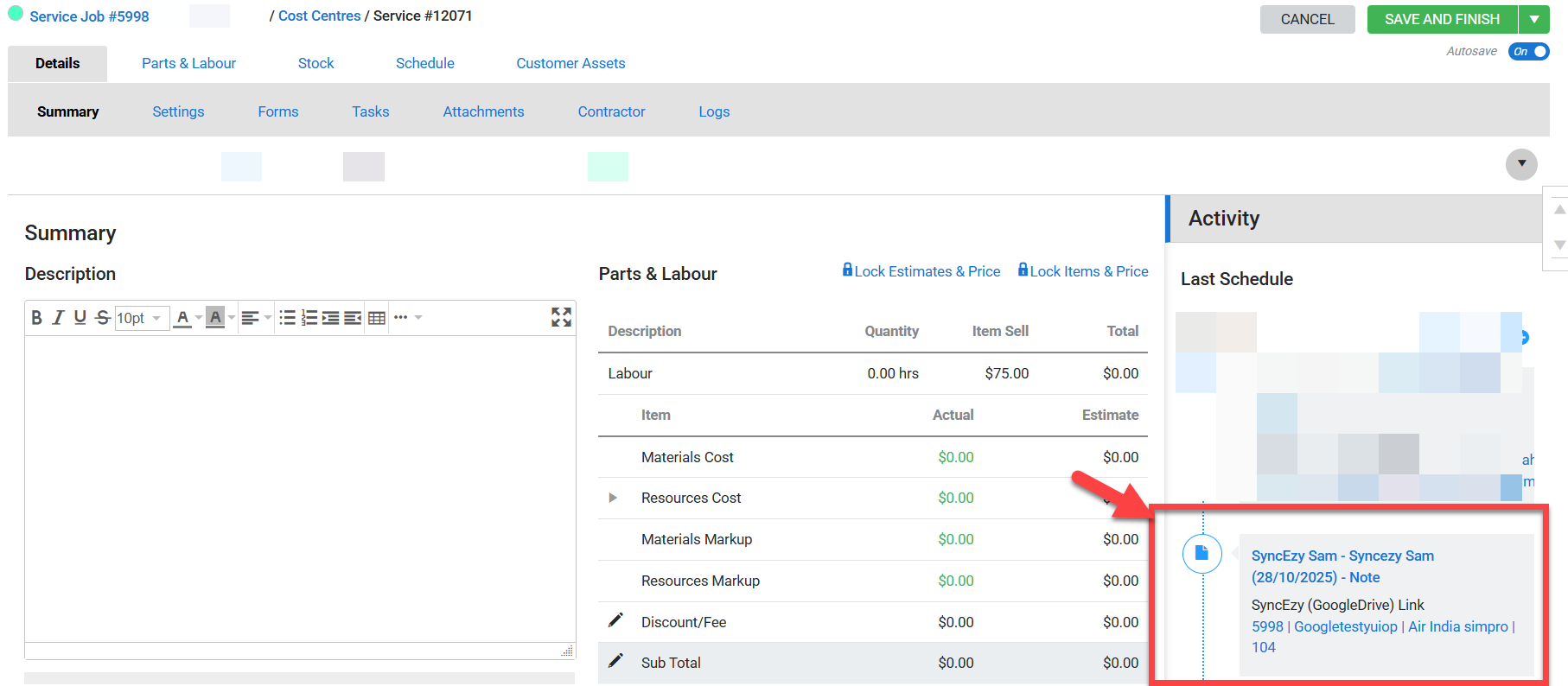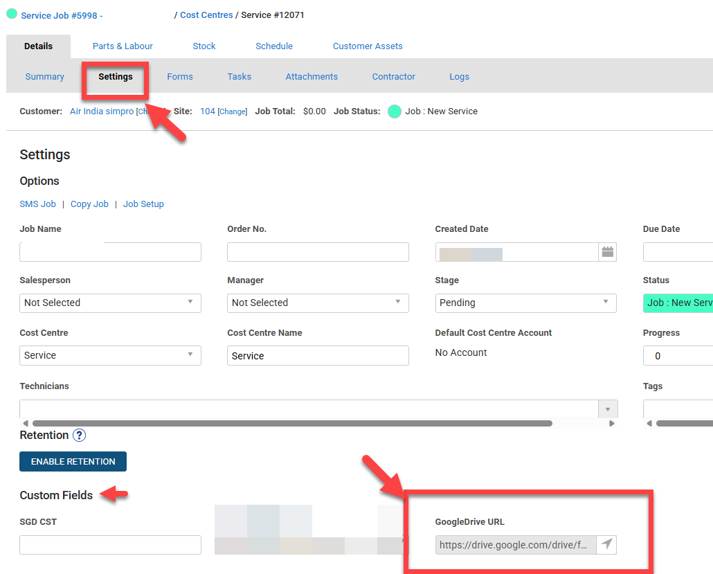The Google Drive folder URL will be displayed in two locations within SimPRO: