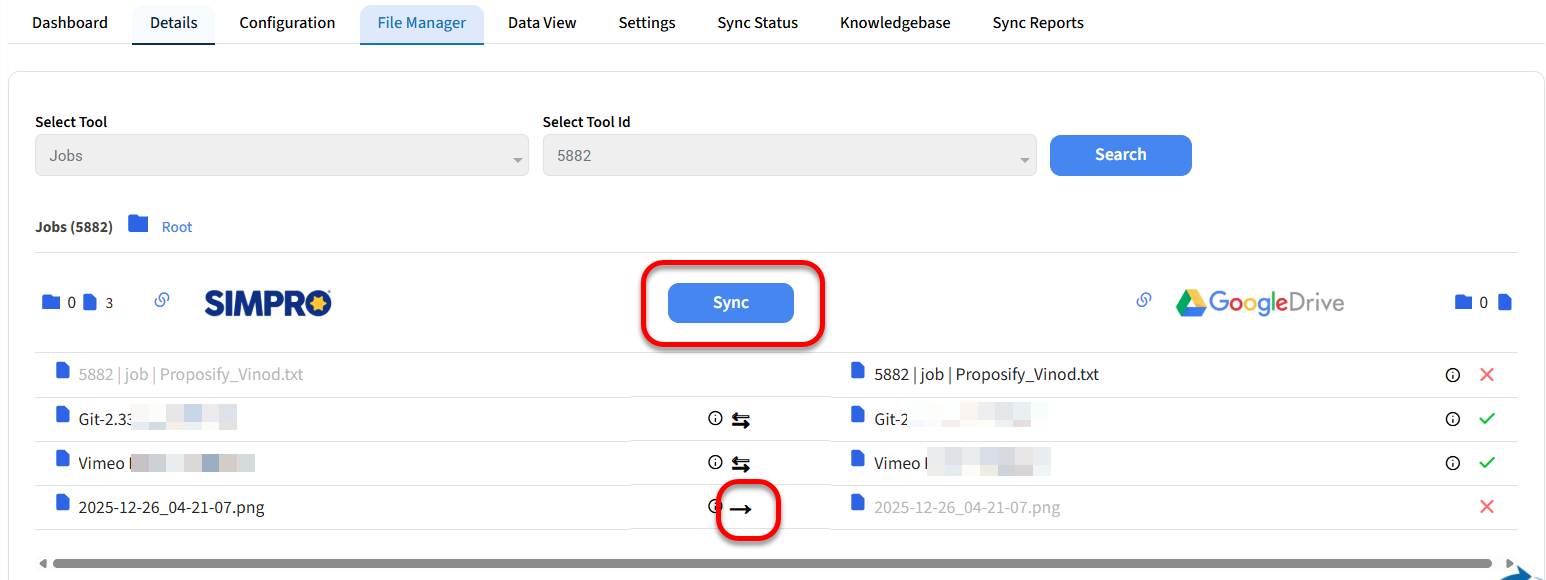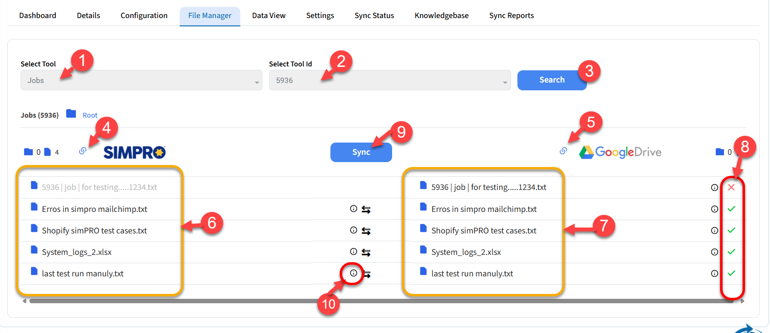 File Comparison Between Systems: The left side lists files from the simPRO tool, and the right side displays files and folders in Google Drive, allowing for an at-a-glance comparison of file counts and contents across both platforms.