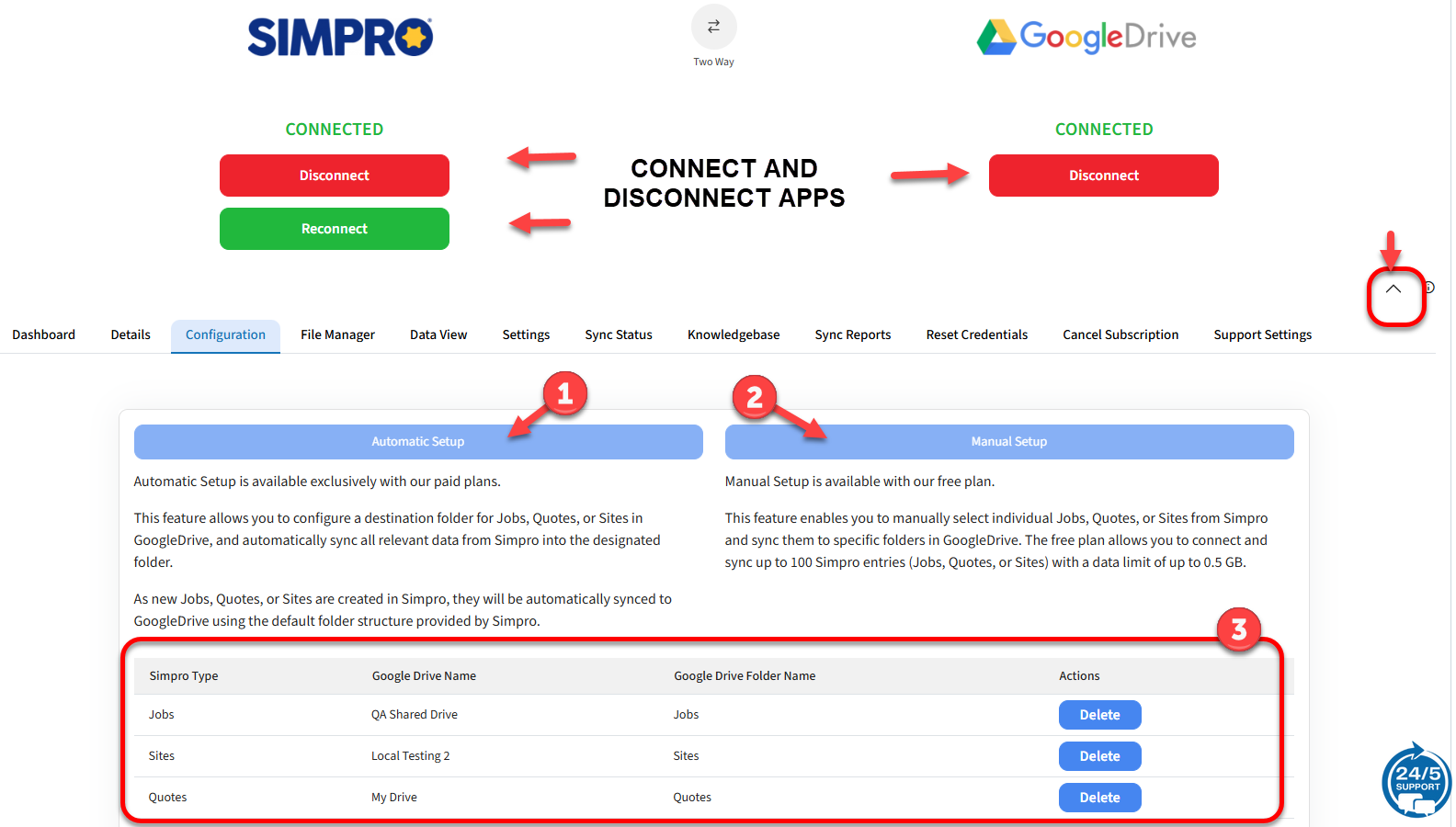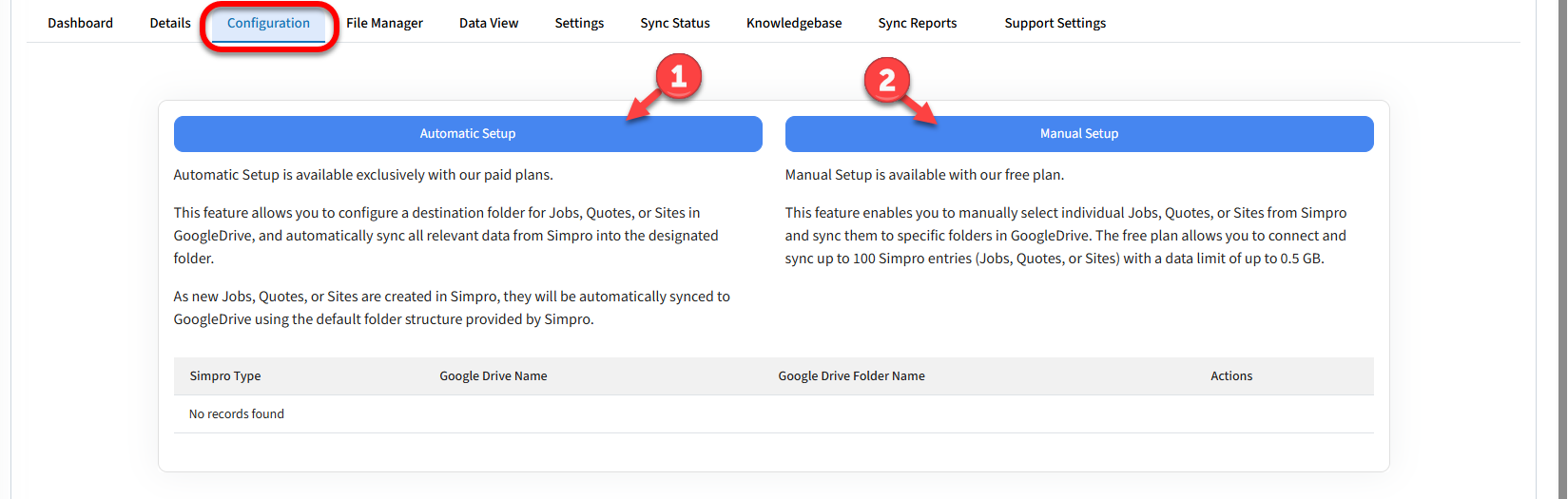 The Configuration tab is the central location where you can add your Jobs, Quotes, or Sites and select the corresponding folder in Google Drive for syncing. To initiate the sync process, you’ll need to add the Jobs/Quotes/Sites to sync by clicking on “Automatic Setup OR Manual Setup”.