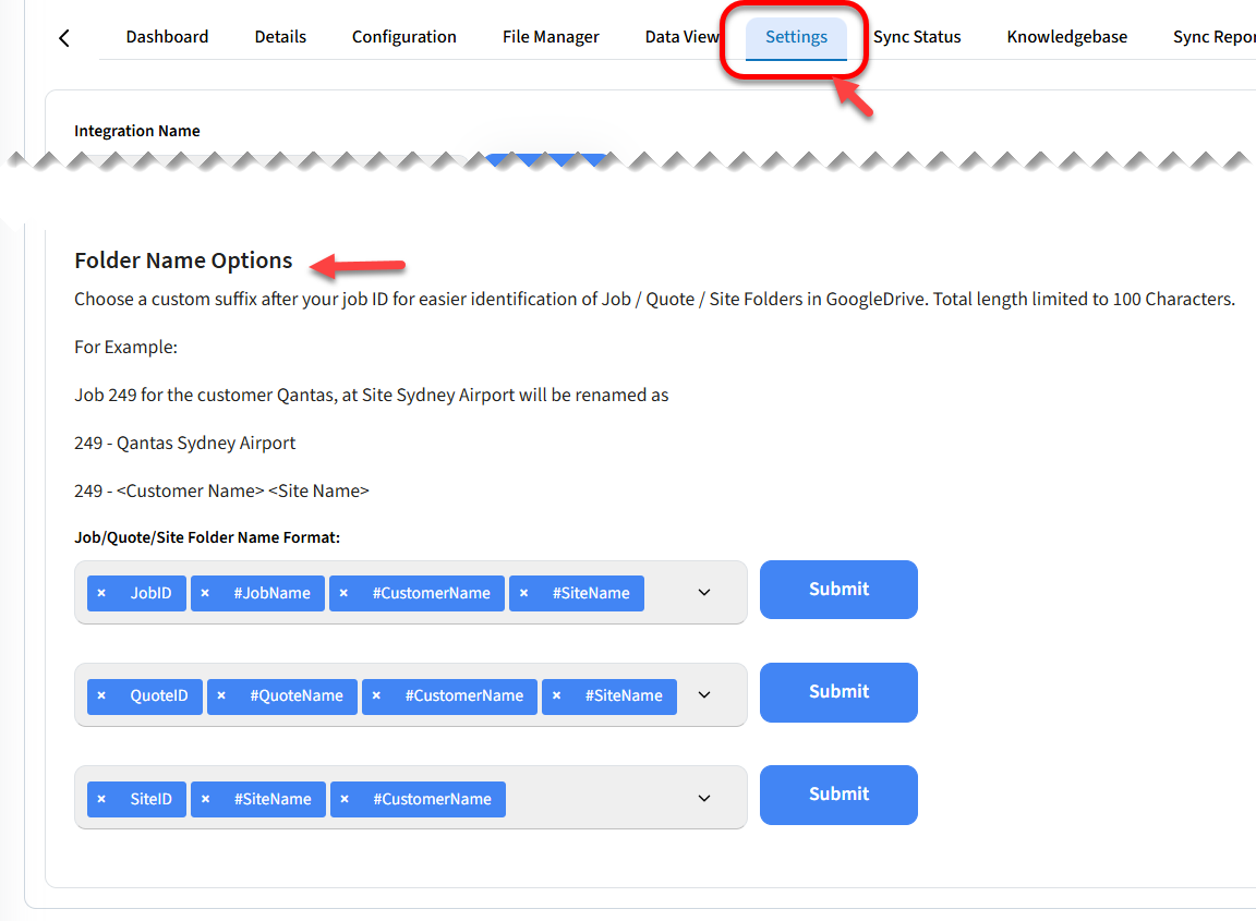 It contains all sync related setting for user to manage. Users can customise integration settings, such as enabling sync delete and its limit, Attachment settings in Simpro etc. App Owners can manage these settings. More information