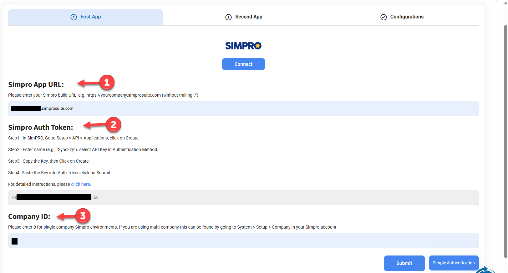 Please see further details about our integration portal using this article - Click on Connect under Simpro and authenticate.