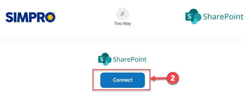 - Once the Simpro user is Authenticated, integration will ask you to connect to Sharepoint. Click on Connect and then enter your Sharepoint credentials. Please confirm if you have the right SharePoint permissions to connect with the integration.