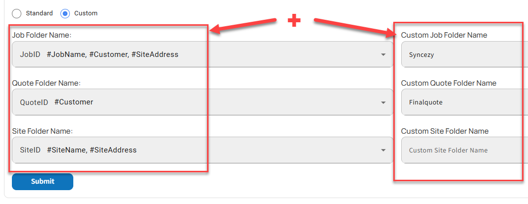 Create a unique folder name for all jobs/quotes/sites by combining metadata fields and custom text. Please be aware that this customization will affect all job/quote or site folders on SharePoint.