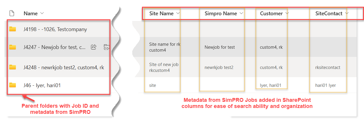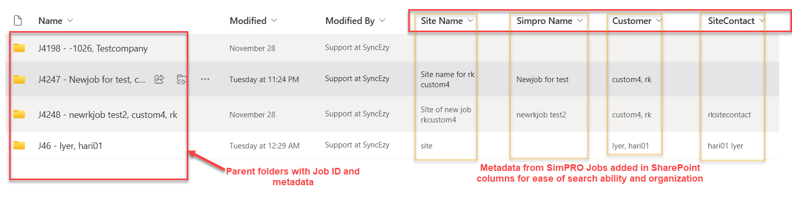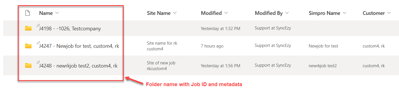 When you connect any module (via Automatic Setup) to a SharePoint location, a folder will be created for each job that is synced. The folder name will include the Job ID and the configuration you set for the folder name. Any attachments from SimPRO will be transferred to this newly created folder. Only changes made within those folders will be synced going forward, ensuring that updates are reflected without affecting other data.
