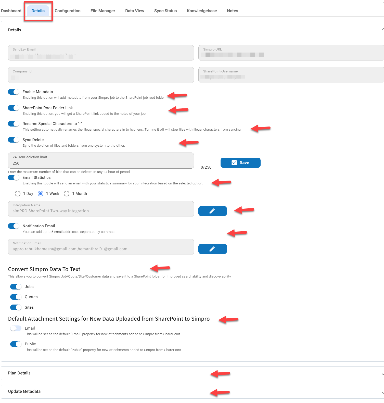 Customise integration settings, such as updating or enabling manual metadata feature, sync delete and its limit, test file generation, Attachment settings in Simpro . Can view details of users who authenticated integration apps. Adjust notifications. For more