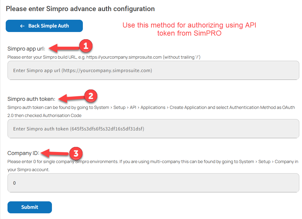 - Add company ID. (For single company it is 0, for multiple companies, Go to Set up in Simpro , click on Company tab to view company id. )